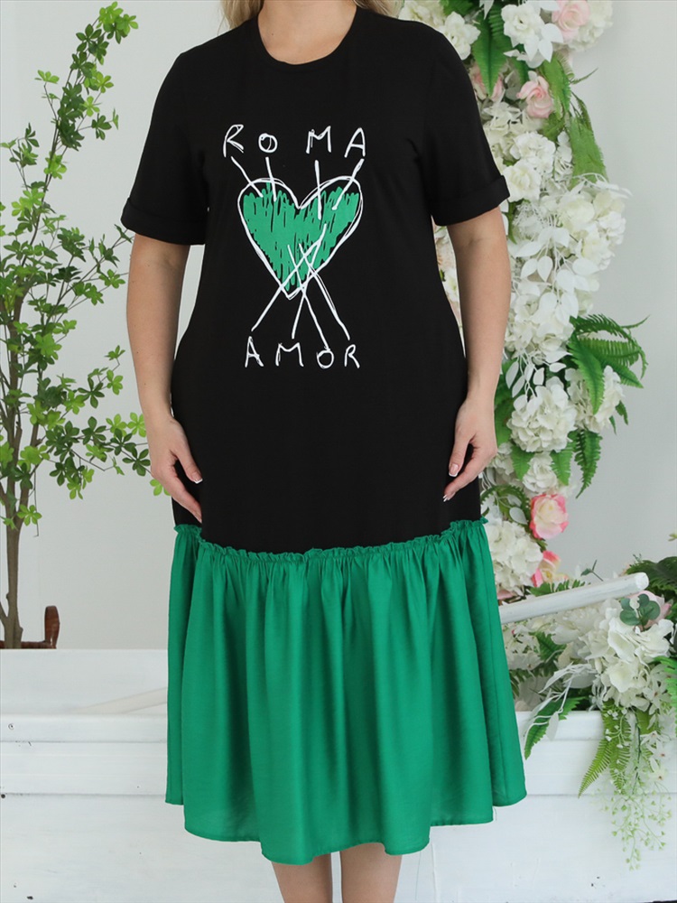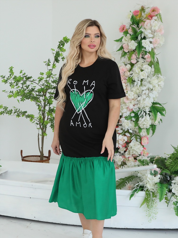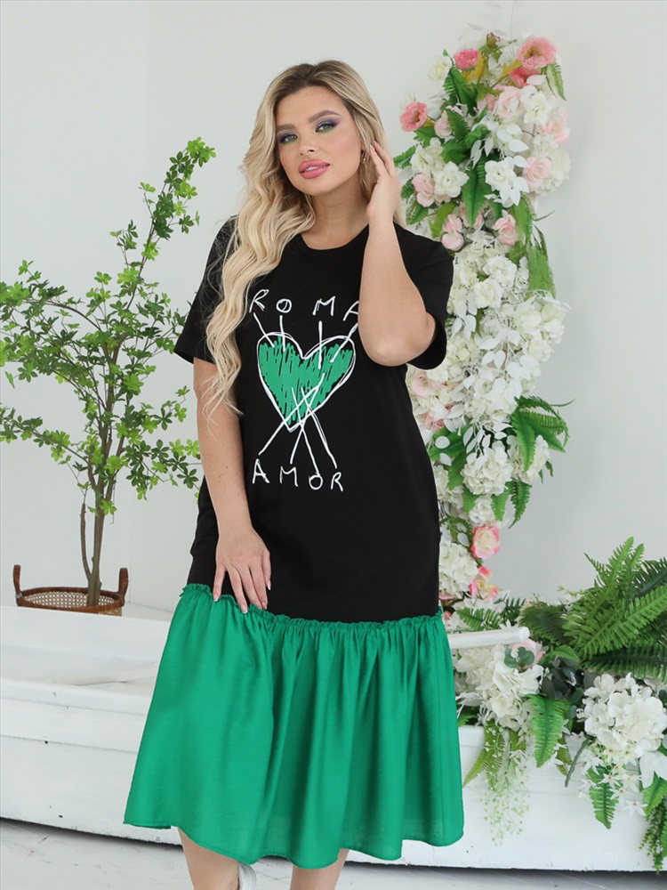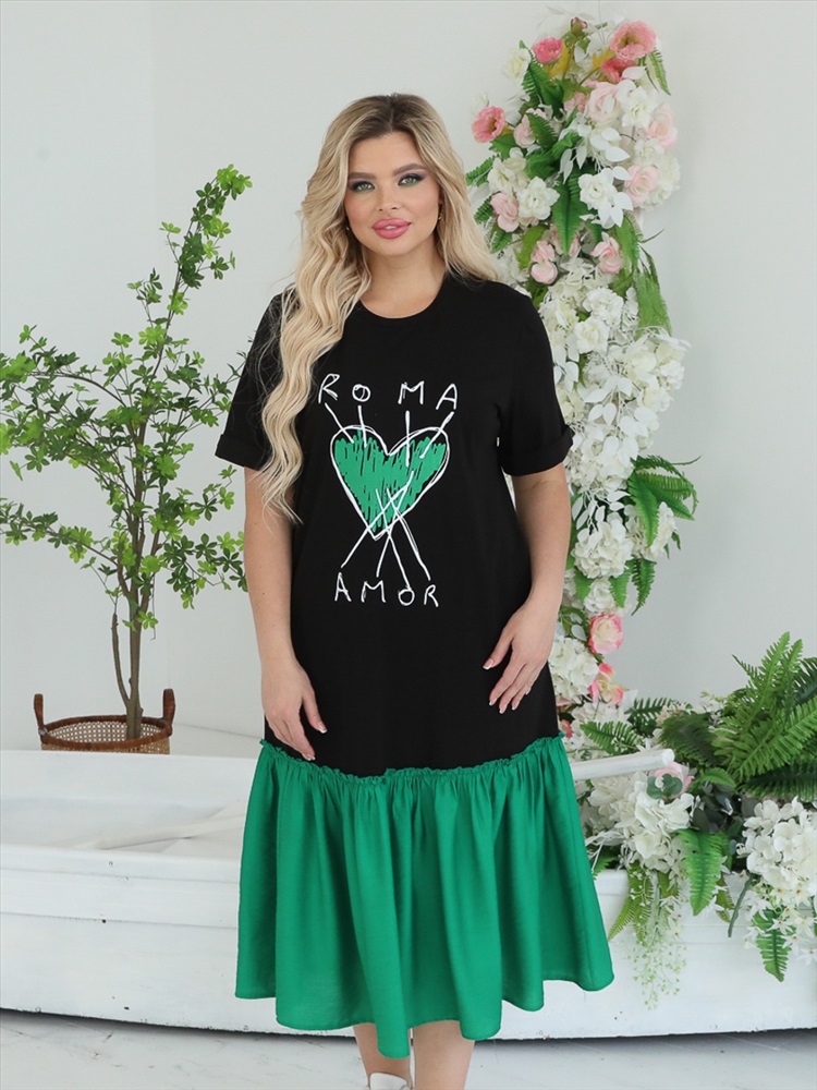 Эффектное платье прямого силуэта из трикотажного полотна черно-зеленого цвета. Круглый вырез изделия обработан внешней обтачкой. Втачные рукава обработаны отворотами. По низу изделия широкая оборка. Длина изделия по спинке от плечевого шва до низа изделия — см. Рост фотомодели - 170 см.