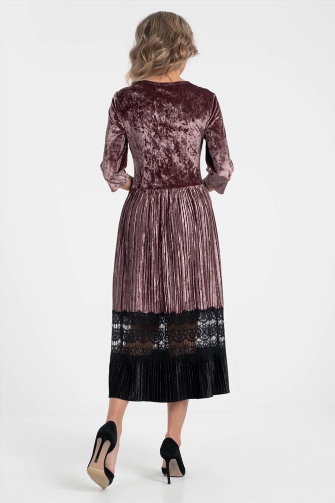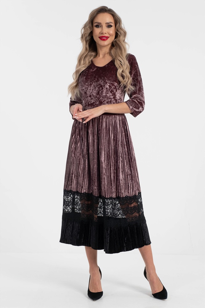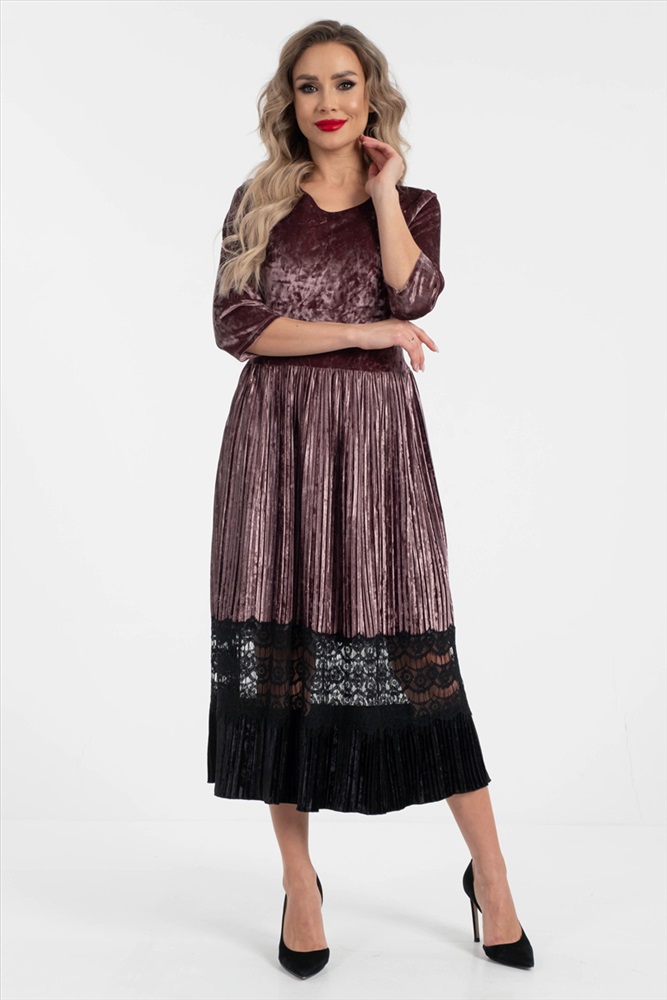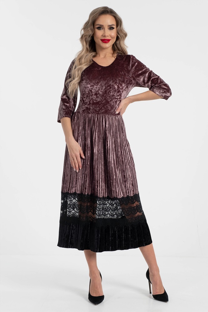 ШтрихКод: 4630328770826 По размеру: 42, 44 Состав: Полиэстер 95% Эластан 5% Срок готовности: 2018-02-14T00-00-00 Роскошное платье полуприлегающего силуэта из трикотажного бархатного полотна сиренево-розового цвета. Круглый вырез горловины обработан внутренней обтачкой. Платье с втачными рукавами. Изделие отрезное по линии талии. Юбка платья выполнена из гофрированного бархатного полотна и дополнена по низу широкой вставкой из кружева. Аксессуары в комплект не входят. Длина изделия по спинке от плечевого шва до низа изделия — 123 см. Рост фотомодели — 170 см Комментарии к товару