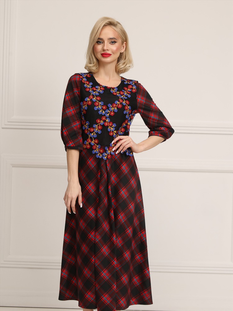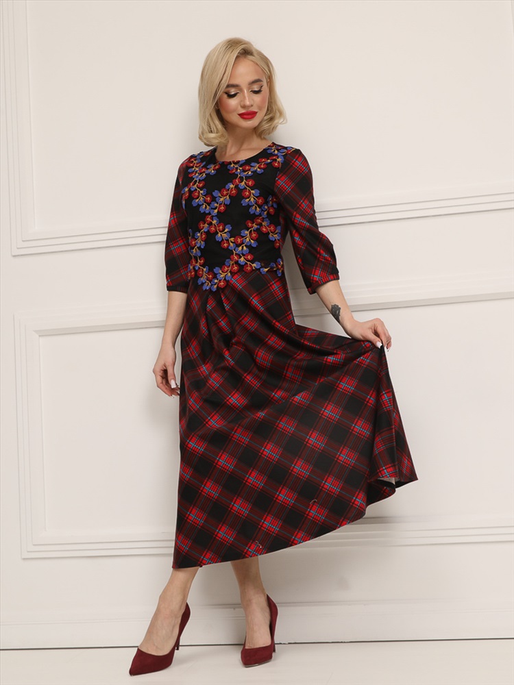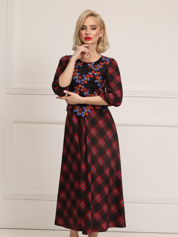 Яркое и романтичное платье полуприлегающего силуэта из трикотажного полотна красно-чёрного цвета. Круглый вырез изделия обработан внутренней обтачкой. Низ втачных рукавов дополнен встречными складками и обработан окантовкой. Перед изделия двойной, дополнен легким вышитым кружевом. Платье отрезное по линии талии. Юбка дополнена складками. Спинка изделия дополнена застежкой на потайную молнию.