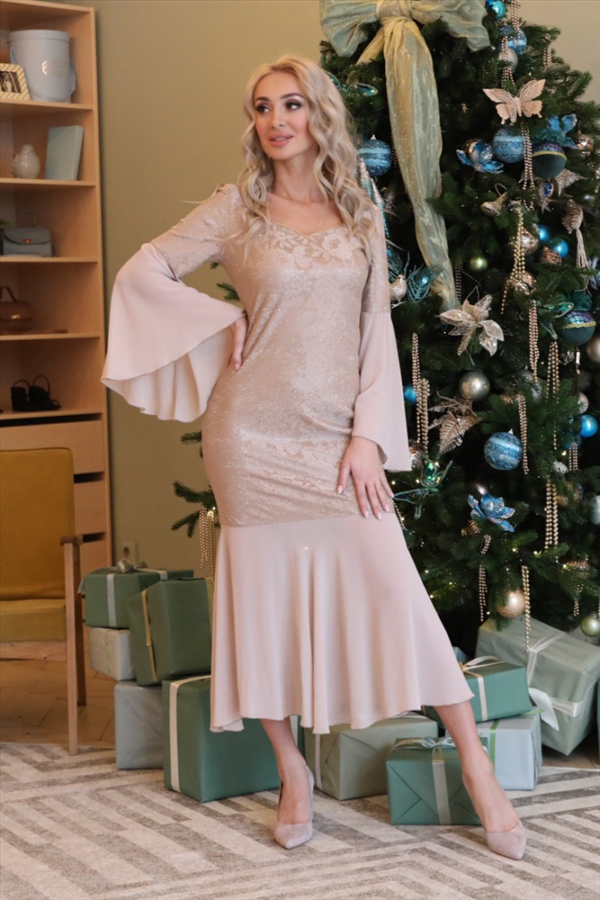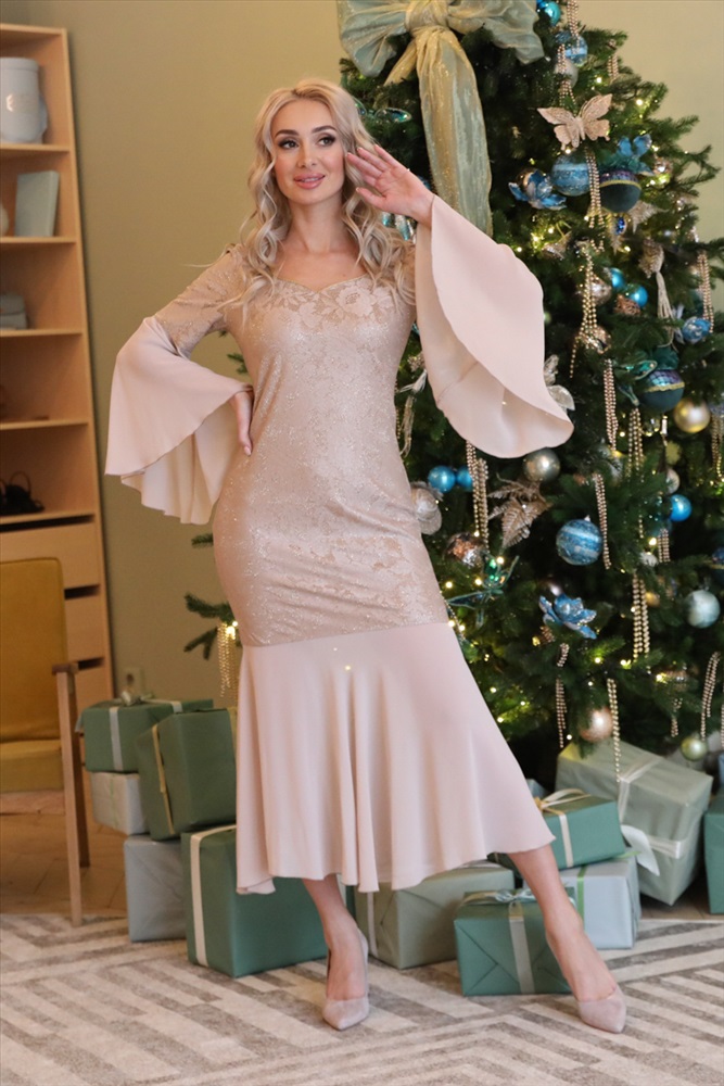 Вечернее платье полуприлегающего силуэта из текстильного полотна (кружево на текстильной основе) бежевого цвета с цветочным узором. Фигурный вырез обработан кантом. Втачные рукава и низ изделия дополнены вставками из струящегося полупрозрачного шифона.