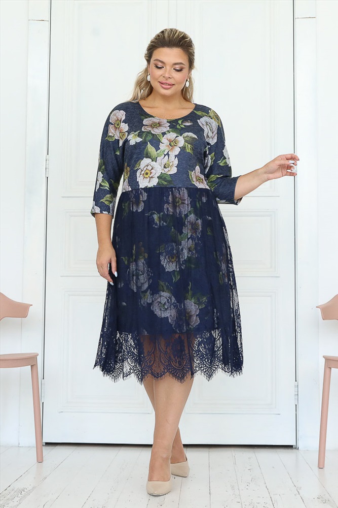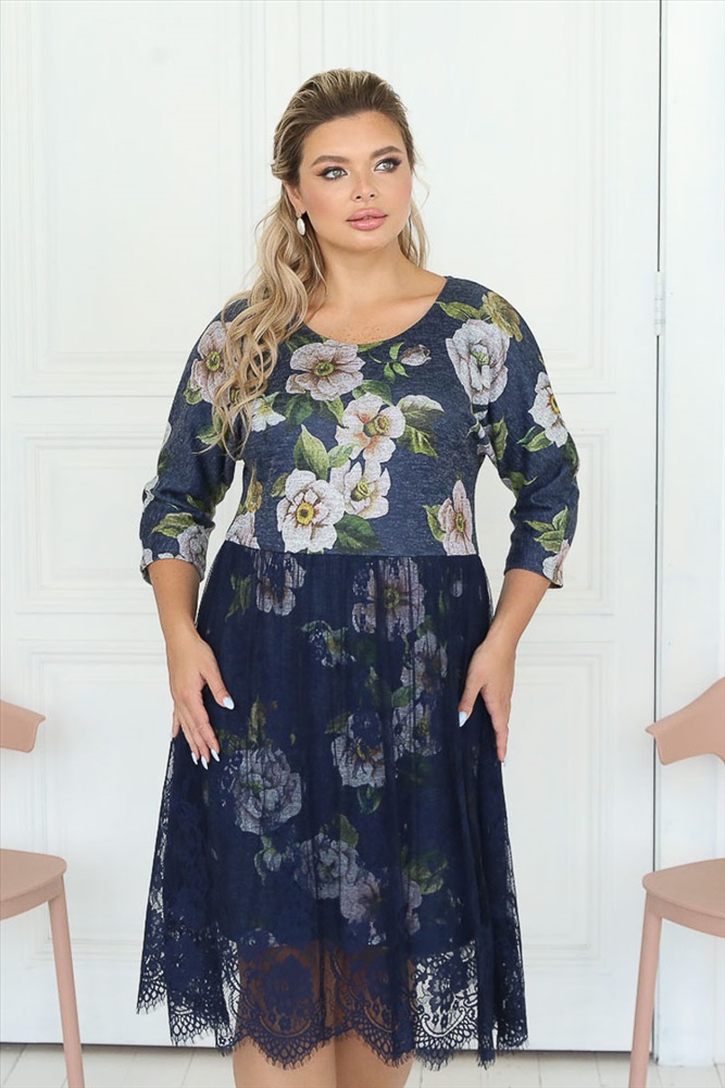 Женственное платье полуприлегающего силуэта из трикотажного полотна темно-синего цвета. Круглый вырез изделия обработан внутренней обтачкой. Платье с цельнокроеными рукавами. Изделие отрезное по линии талии. Линия талии завышена. Низ платья двойной, верхний слой выполнен из роскошного кружева, а нижний из основной ткани.