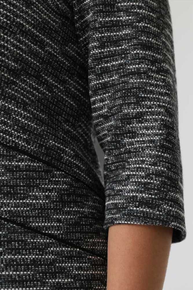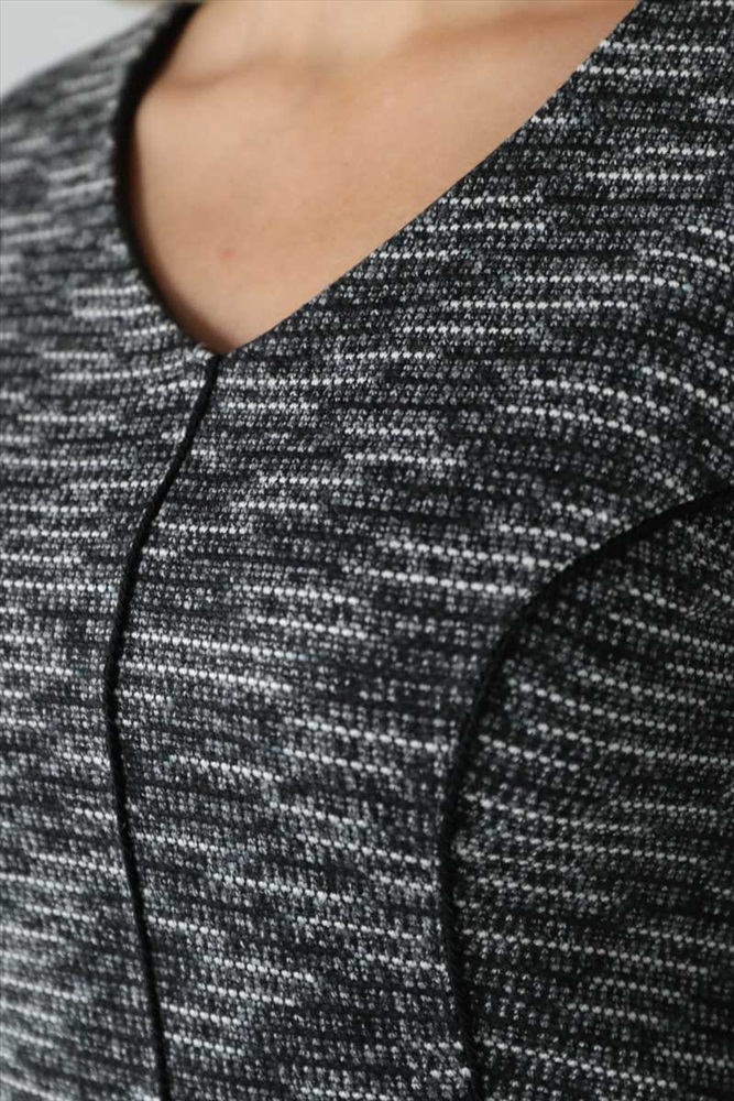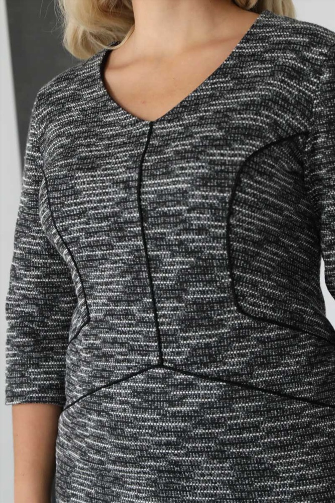 Элегантное платье приталенного силуэта из плотного трикотажного полотна серого цвета. V-образный вырез изделия обработан внутренней обтачкой. Платье с втачными рукавами три четверти. Перед и линия талии дополнены декоративными кантами черного цвета. Спинка платья дополнена застежкой на потайную молнию и разрезом.