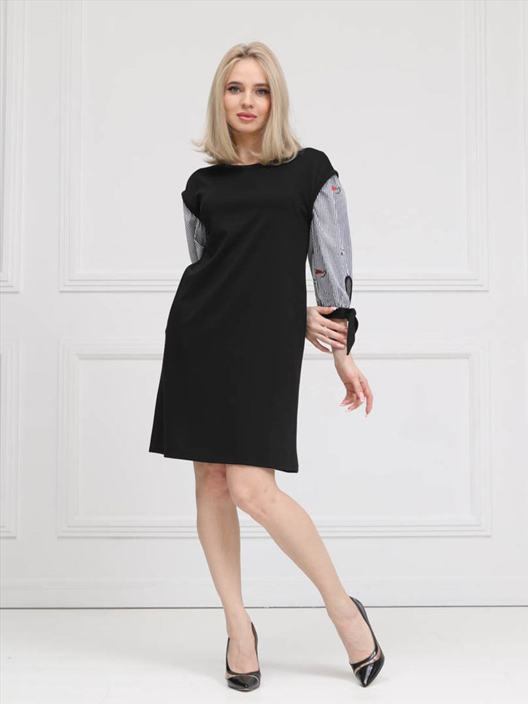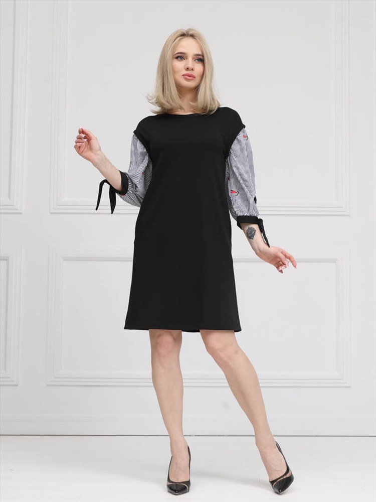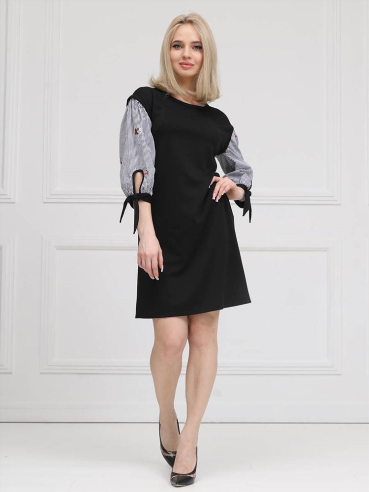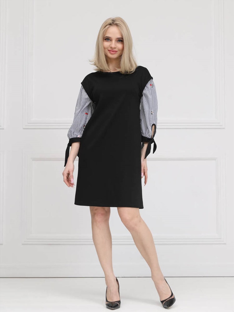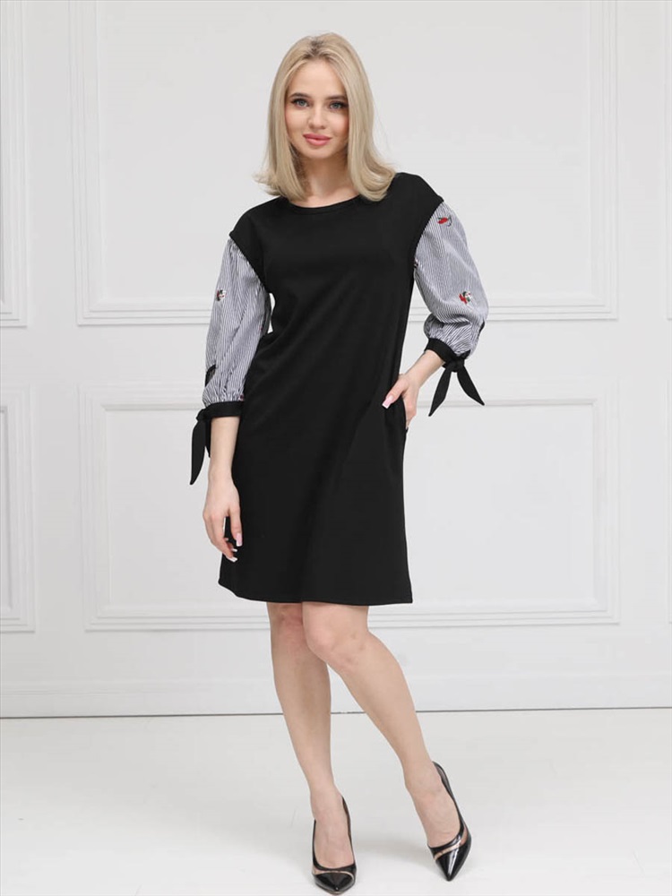 ШтрихКод: 4630328708362 По размеру: 42, 44, 46, 48, 50 Состав: Вискоза 95% Эластан 5% Срок готовности: 2018-01-28T00-00-00 Уютное платье полуприлегающего силуэта из плотного трикотажного полотна черного цвета. Круглый вырез изделия обработан окантовкой. Втачные рукава со спущенной линией проймы выполнены из текстильного полотна в сине-белую полоску с вышивкой. Низ рукавов дополнен разрезом «капелькой» и обработан манжетами на завязках. В боковых швах - втачные карманы. Аксессуары в комплект не входят. Длина изделия по спинке от плечевого шва до низа изделия — 93 см. Рост фотомодели — 170 см. Комментарии к товару