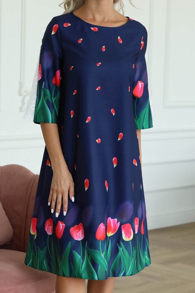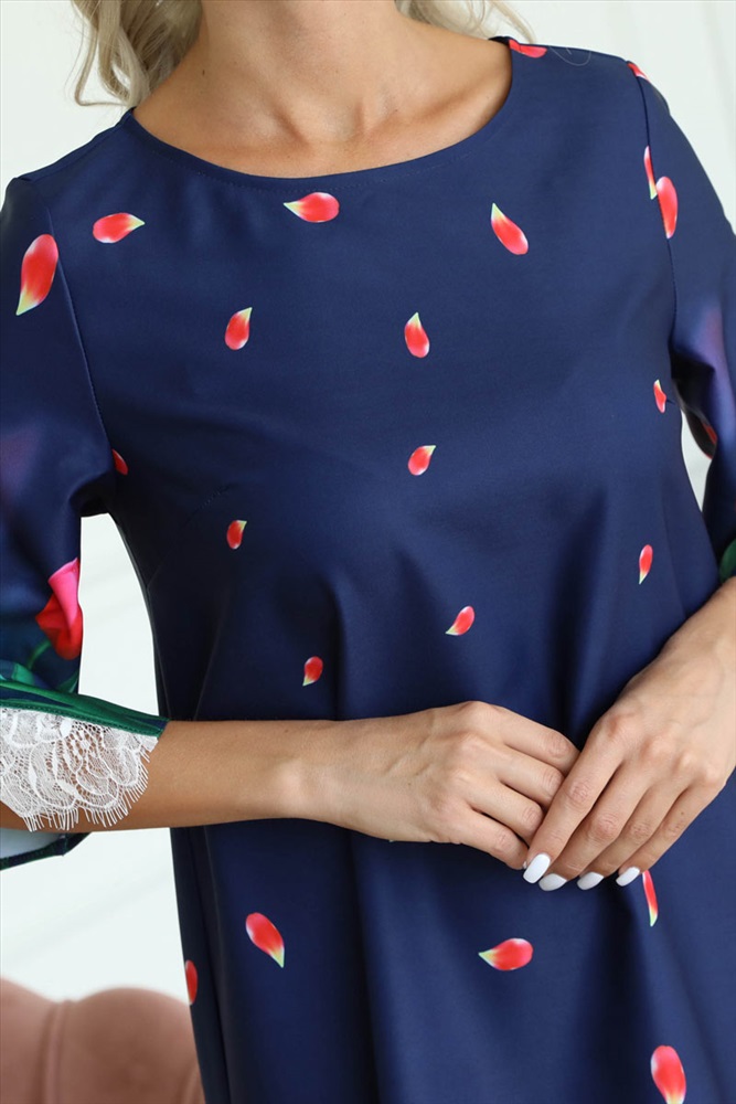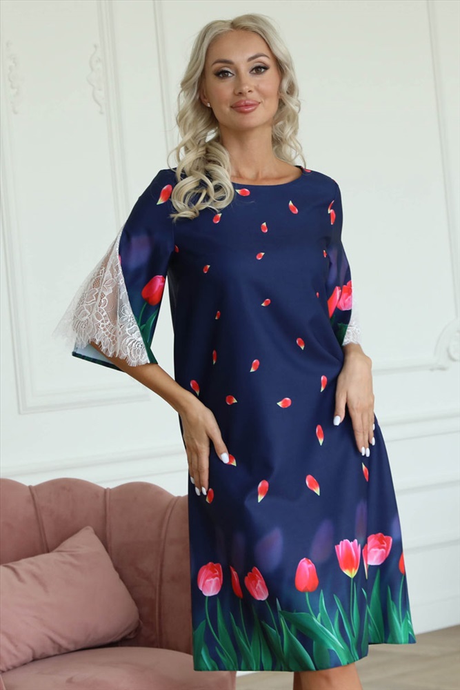 ШтрихКод: 4630328710365 По размеру: 42, 46 Состав: Вискоза 65% Полиэстер 30% Эластан 5% Скидка на сайте: 50% Срок готовности: 2019-04-20T00-00-00 Очаровательное платье А-силуэта из текстильного полотна с купонным рисунком синего цвета. Круглый вырез изделия обработан внутренней атласной бейкой. Втачные рукава дополнены вставкой из кружева. Аксессуары в комплект не входят. Длина изделия по спинке от плечевого шва до низа изделия -101 см.. Рост фотомодели — 170 см. Комментарии к товару