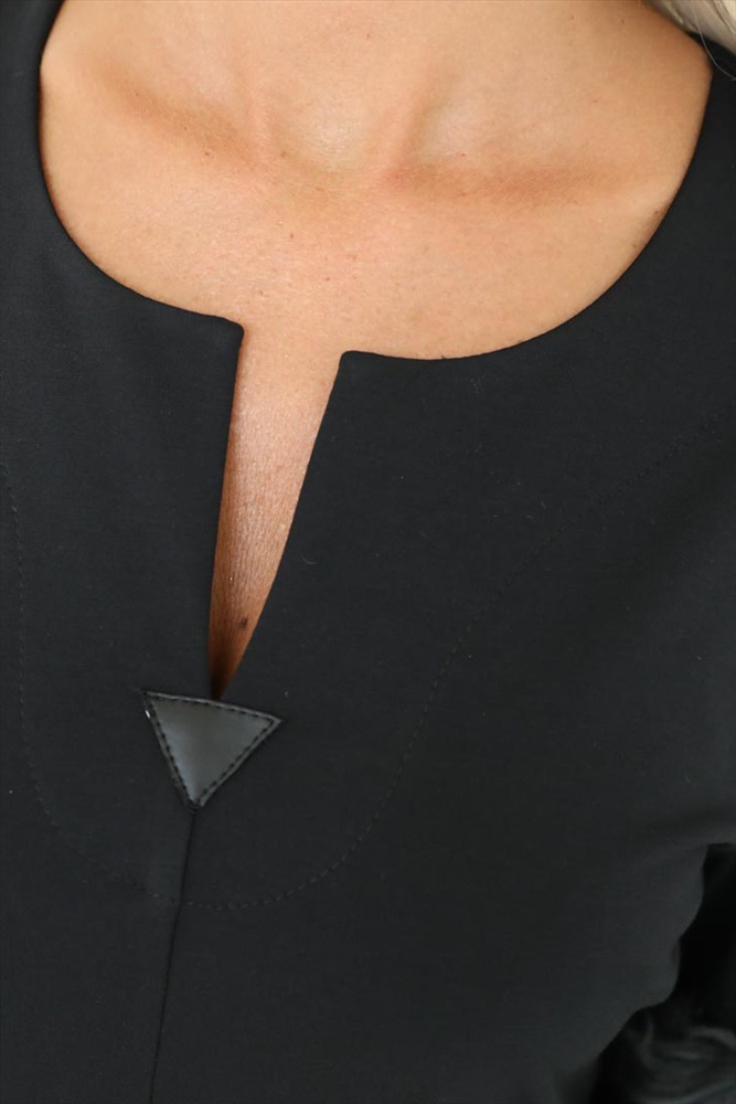 Роскошное платье полуприлегающего силуэта из трикотажного полотна черного цвета. Круглый вырез дополнен изящным разрезом. Втачные рукава дополнены вставками из искусственного меха. Платье с отрезной юбкой по линии талии Длина изделия по спинке от плечевого шва до низа изделия — 110 см. Рост фотомодели — 170 см.