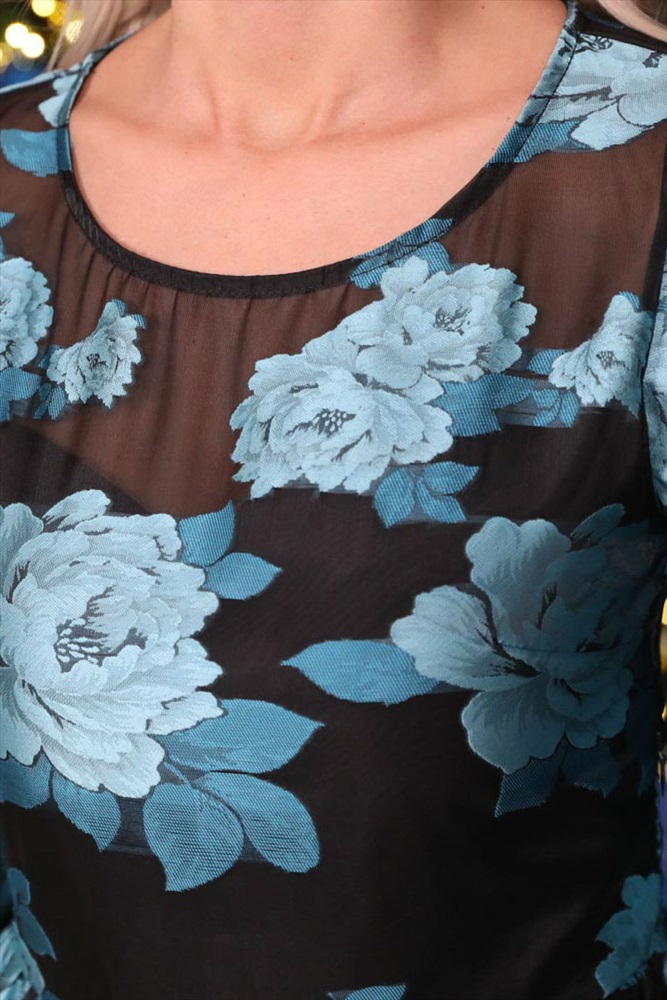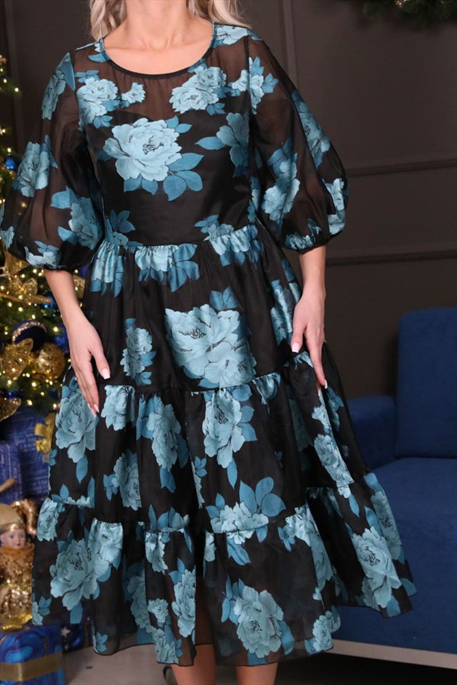 Роскошное платье полуприлегающего силуэта черно-мятного цвета. Платье двойное, нижнее платье из легкой текстильной ткани, верхнее из декоративной сетки. Круглый вырез изделия обработан внутренней бейкой. Втачные рукава выполнены из сетки обработаны бейкой. Шикарная юбка состоит из широких оборок. Низ изделия обработан декоративным швом "закрутка". Ремень в комплект не входит.
