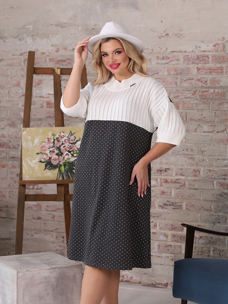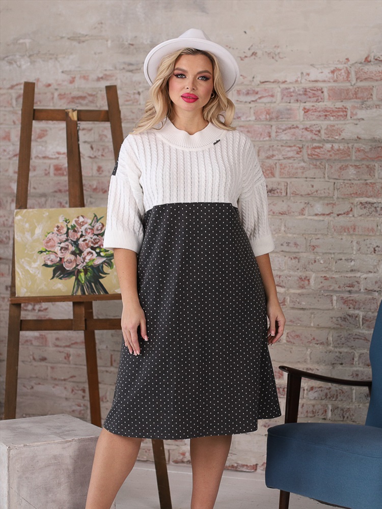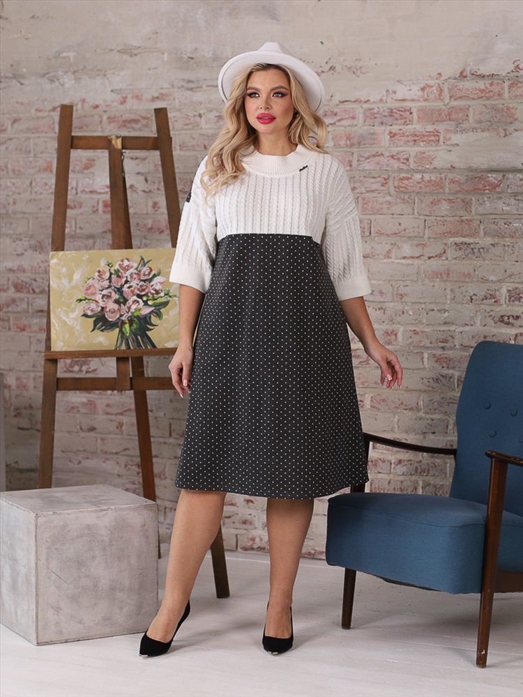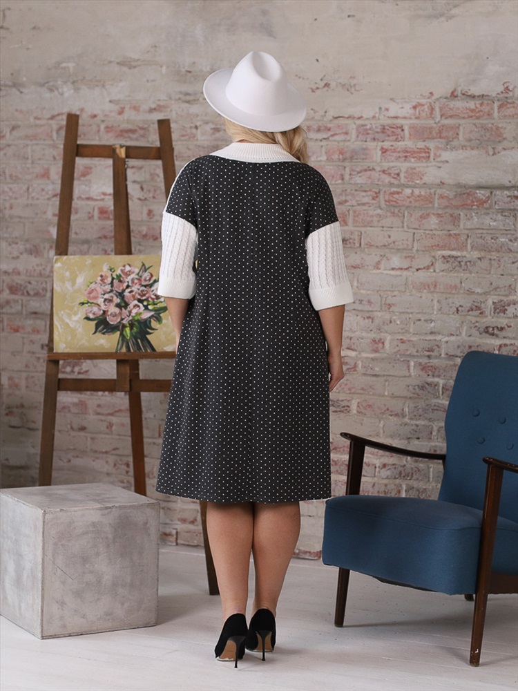 Очаровательное платье полуприлегаюшего силуэта из трикотажного полотна сергого цвета. Верхняя часть платья выполнена в технике ручного вязания, вывязан рисунок «косы». Круглый вырез платья обработан резинкой 1х1 с кеттлевкой. Платье со спущенной проймой и втачными рукавами. По бокам изделия — карманы. Длина изделия по спинке от плечевого шва до низа изделия — 100 см. Аксессуары в комплект не входят.
