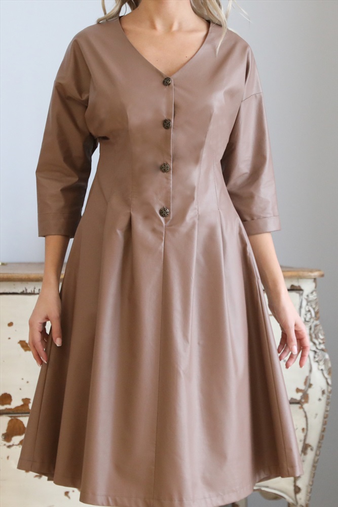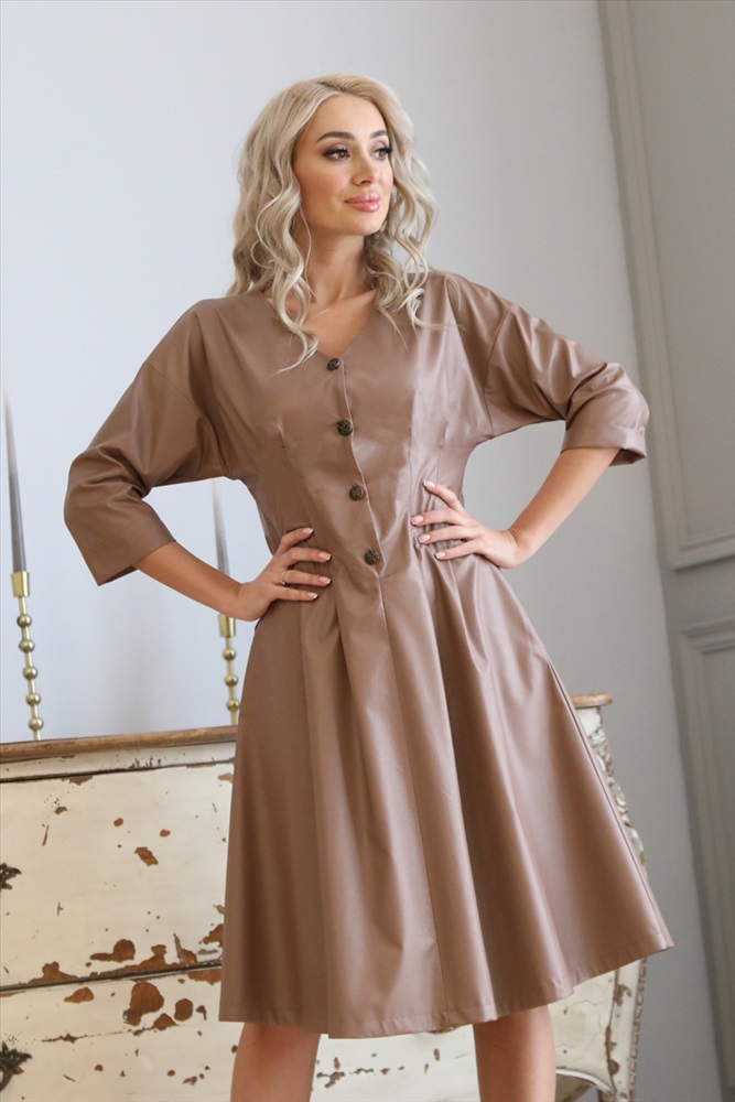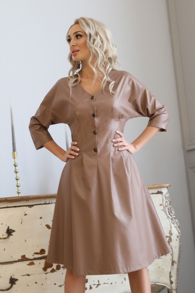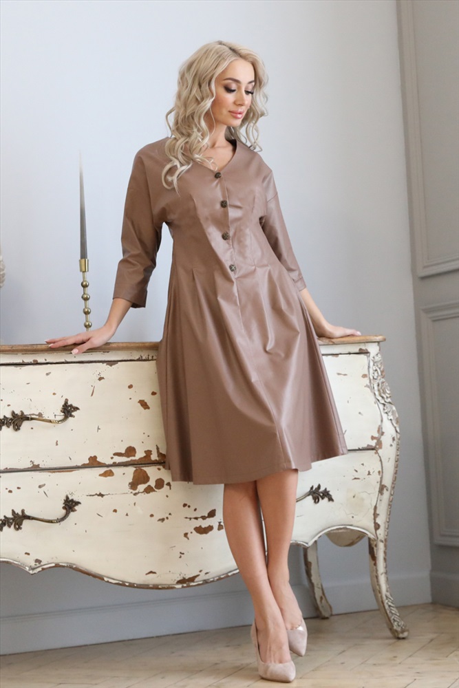 Эффектное платье полуприлегающего силуэта из эко-кожи бежевого цвета. V-образный вырез изделия обработан внутренней обтачкой. Платье со спущенной проймой и втачными рукавами. По переду изделия выполнена планка с застежкой на пуговиц. Платье дополнено декоративными отстрочками. По боковым швам - карманы Длина изделия по спинке от плечевого шва до низа изделия - 100 см. Рост фотомодели — 170 см.