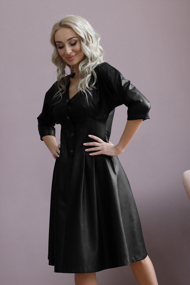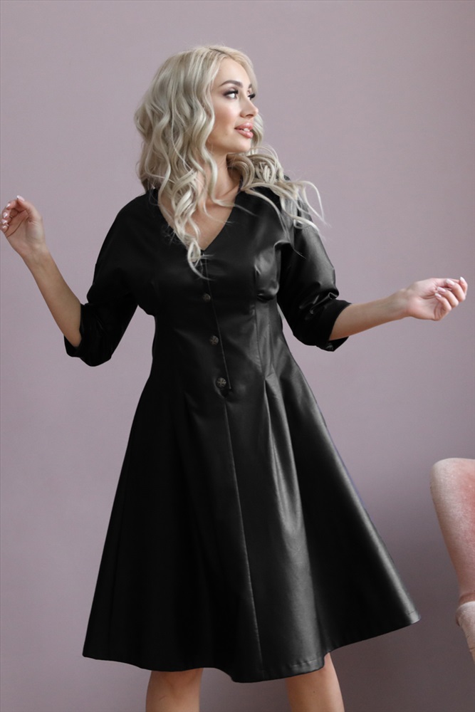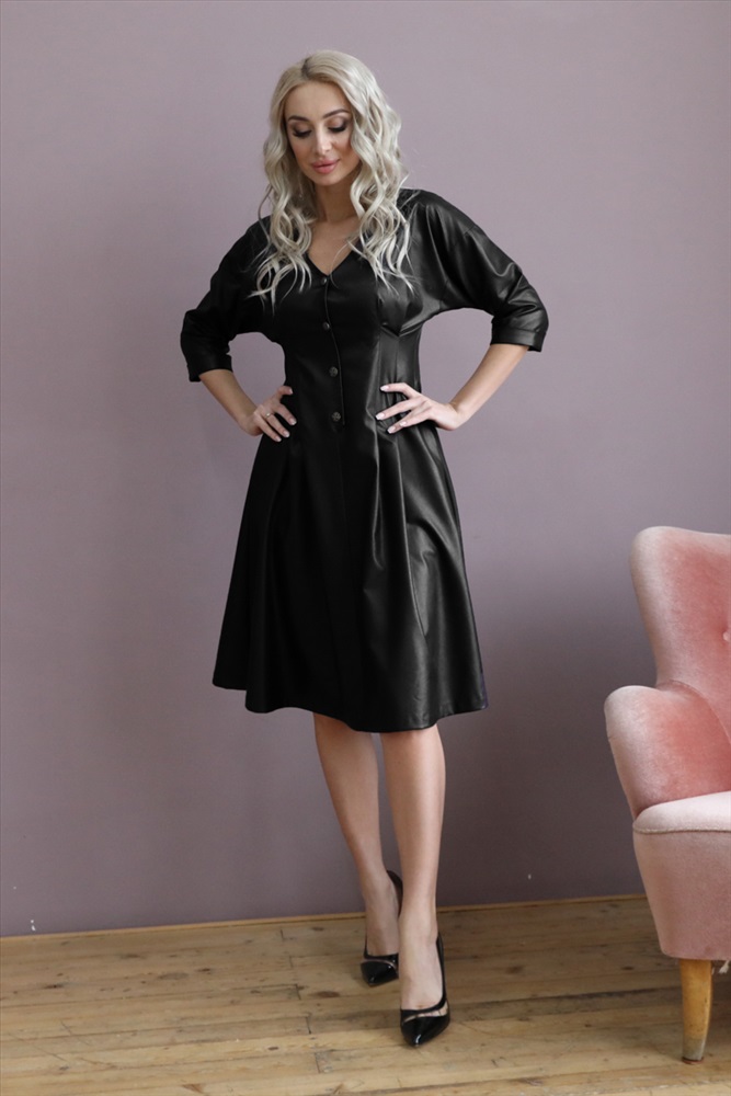 ШтрихКод: 4630328713281 По размеру: 42, 44, 46, 48, 50 Состав: Полиэстер 95% Эластан 5% Скидка на сайте: 20% Срок готовности: 2021-12-20T00-00-00 Эффектное платье полуприлегающего силуэта из эко-кожи черного цвета. V-образный вырез изделия обработан внутренней обтачкой. Платье со спущенной проймой и втачными рукавами. По переду изделия выполнена планка с застежкой на пуговиц. Платье дополнено декоративными отстрочками. По боковым швам - карманы Длина изделия по спинке от плечевого шва до низа изделия - 100 см. Рост фотомодели — 170 см. Комментарии к товару