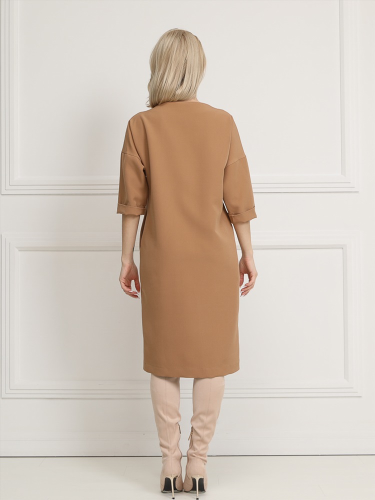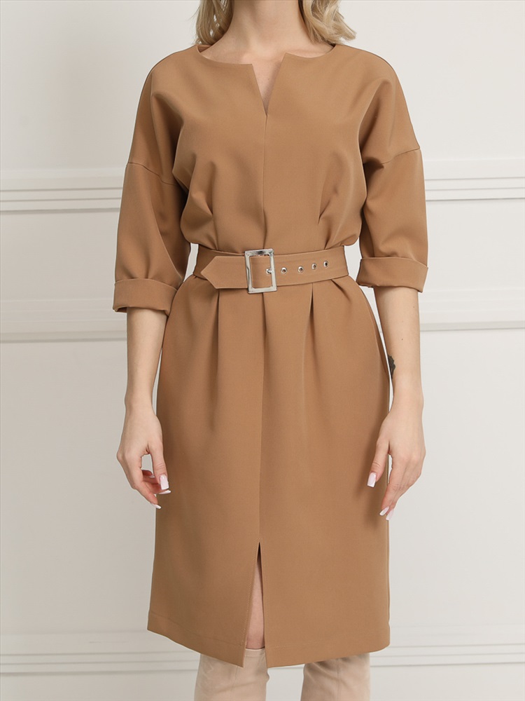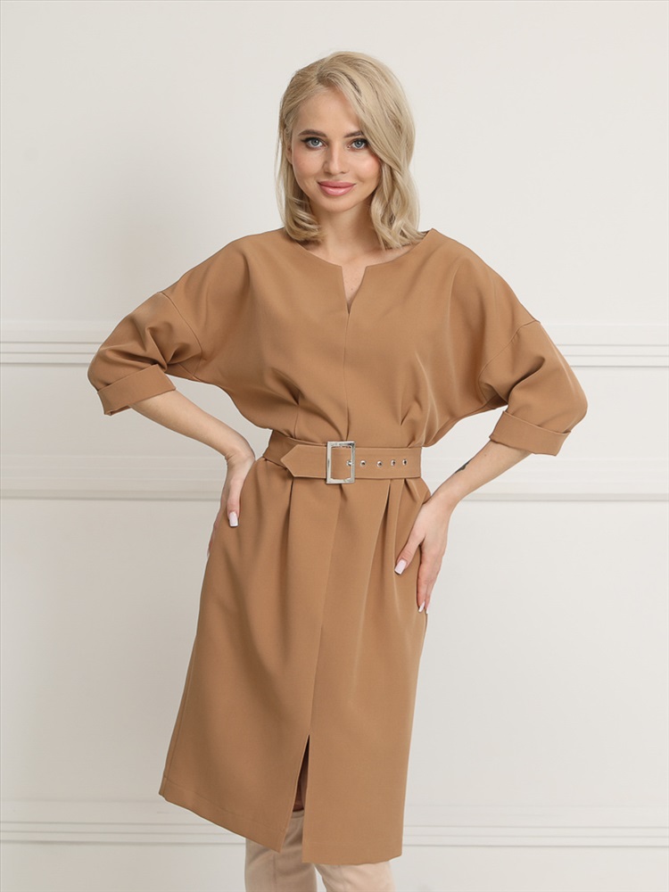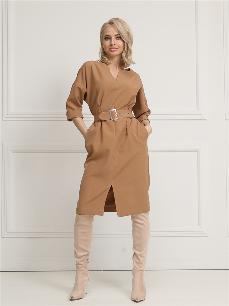 Эффектное платье полуприлегающего силуэта из текстильной ткани бежевого цвета. Круглый вырез изделия обработан внутренней обтачкой и дополнен фигурным вырезом. Цельнокренные рукава обработаны манжетами. По бокам изделия — внутренние карманы. По переду - разрез. В комплект вхолит пояс с металлической пряжкой. Длина изделия по спинке от плечевого шва до низа изделия - 100 см. Рост фотомодели - 170 см.