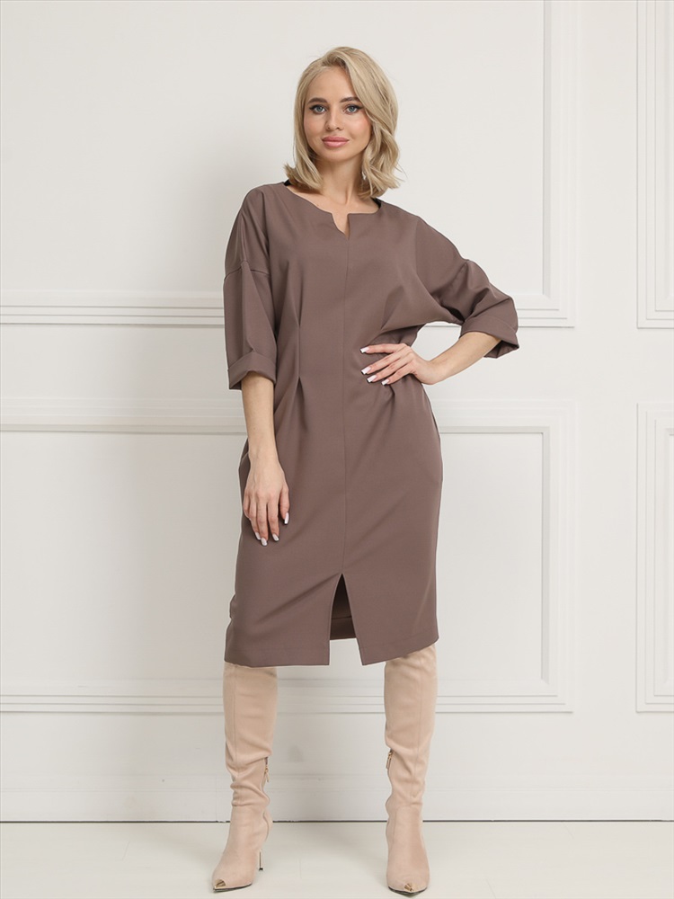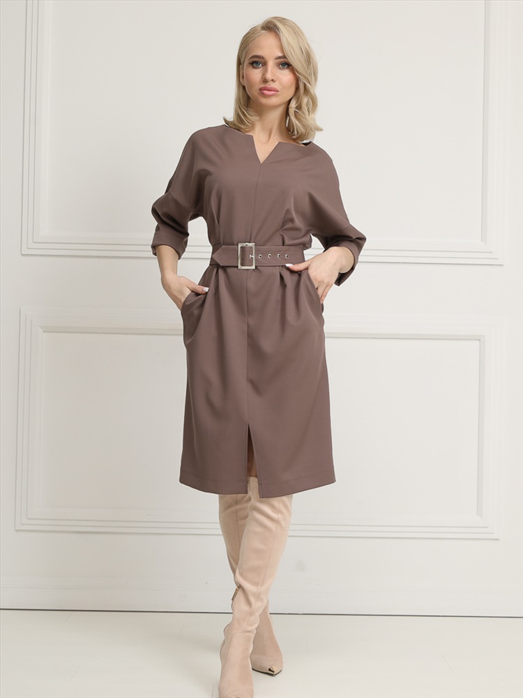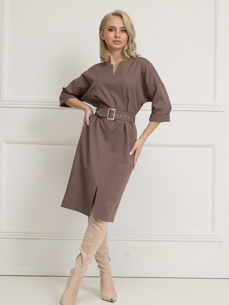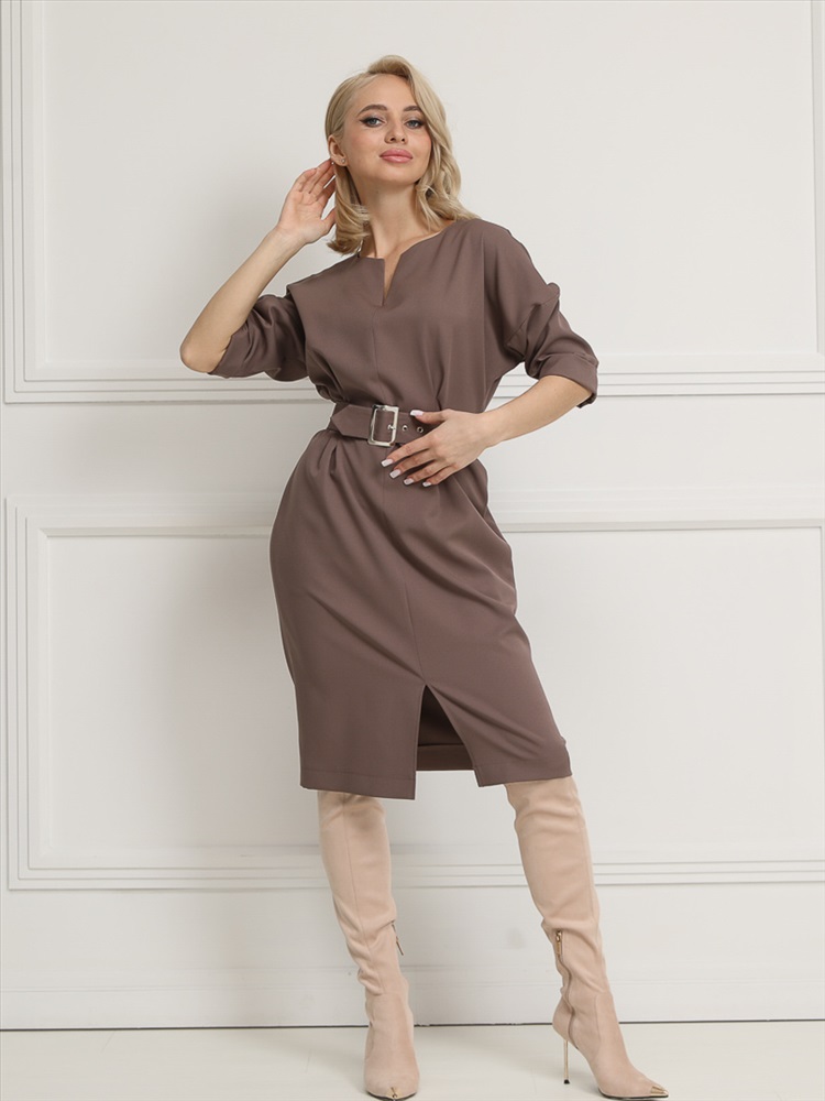 Срок готовности: 2024-11-25T00-00-00 Эффектное платье полуприлегающего силуэта из текстильной ткани коричневого цвета. Круглый вырез изделия обработан внутренней обтачкой и дополнен фигурным вырезом. Цельнокренные рукава обработаны манжетами. По бокам изделия — внутренние карманы. По переду - разрез. В комплект вхолит пояс с металлической пряжкой. Длина изделия по спинке от плечевого шва до низа изделия - 100 см. Рост фотомодели - 170 см.