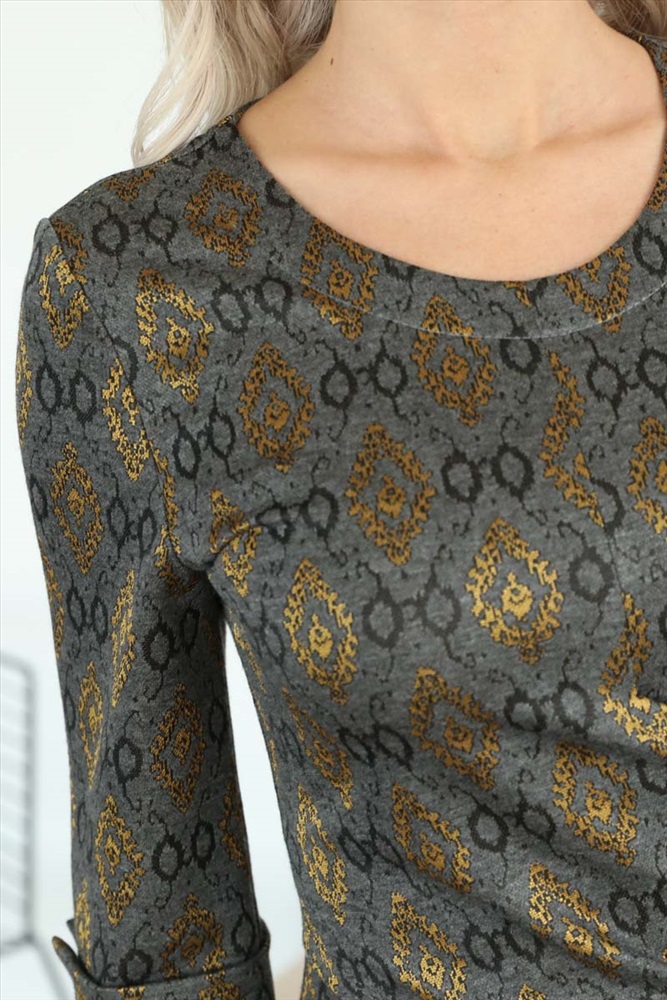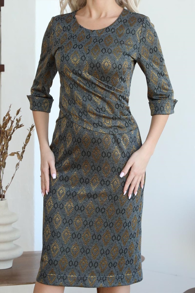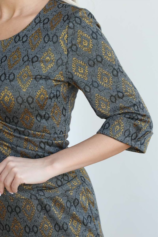 ШтрихКод: 4630328714226 По размеру: 46, 56 Состав: Вискоза 30% Полиэстер 65% Эластан 5% Срок готовности: 2022-12-12T00-00-00 Очаровательное платье прилегающего силуэта из трикотажного полотна серо-золотого цвета. Круглый вырез изделия обработан внутренней обтачкой. Втачные рукава обработаны манжетами. Перед изделия дополнен сборкой. Длина изделия по спинке от плечевого шва до низа изделия - 106 см. Рост фотомодели — 170 см. Комментарии к товару