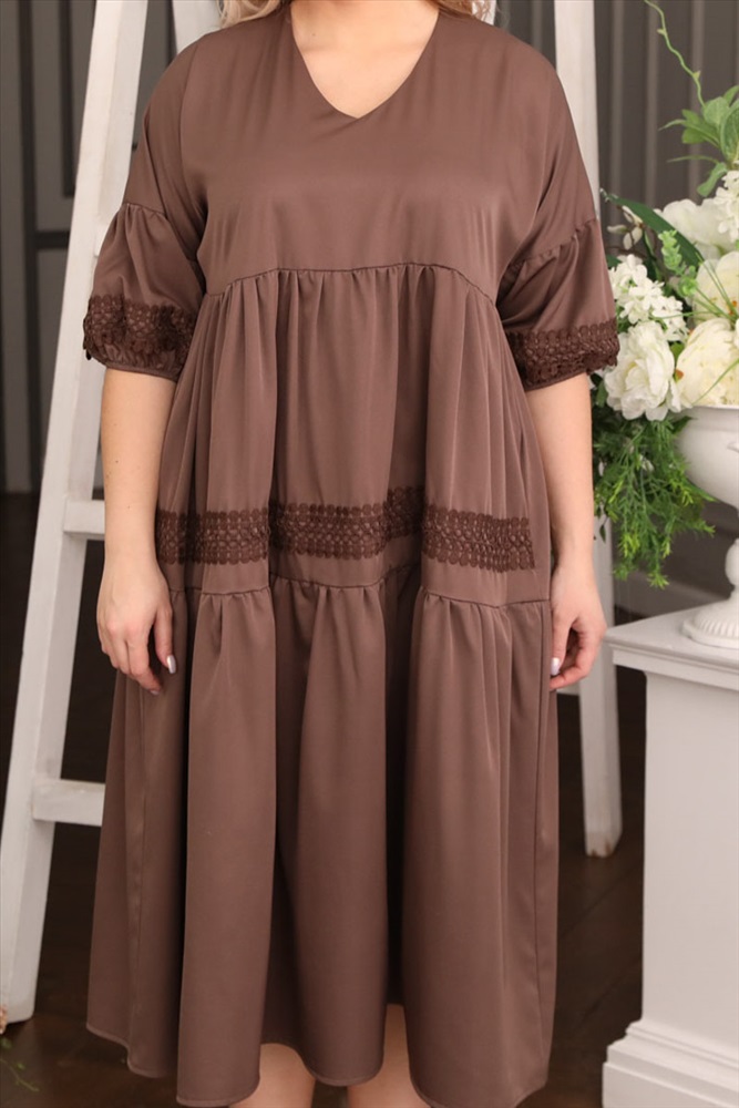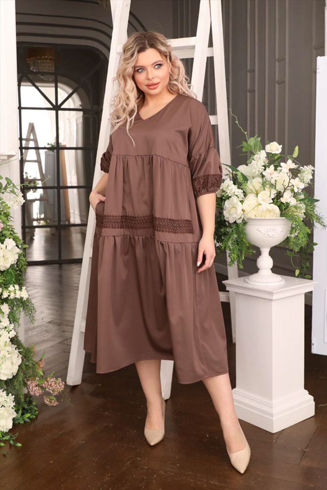 По размеру: 50 Состав: Вискоза 30% Полиэстер 65% Эластан 5% ШтрихКод: 4630328714837 Скидка на сайте: 50% Срок готовности: 2023-04-05T00-00-00 Нежное платье свободного силуэта из текстильной ткани коричневого цвета. Фигурный вырез изделия обработан внутренней обтачкой. Платье со спущенной проймой, втачные рукава обработаны внутренней резинкой и декоративным кружевом. Линия груди эффектно подчеркнута сборкой. Перед изделия дополнен кружевом. Длина изделия по спинке от плечевого шва до низа изделия — 121 см. Рост фотомодели 170 см. Комментарии к товару