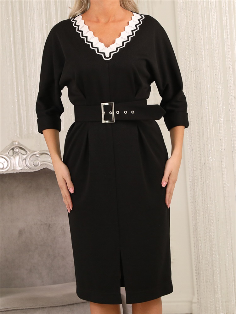 Стильное платье полуприлегающего силуэта из трикотажного полотна черного цвета. V-образный вырез подчеркнут трикотажным подвязом Цельнокренные рукава обработаны манжетами. По бокам изделия — внутренние карманы. По переду - разрез. В комплект вхолит пояс с металлической пряжкой. Длина изделия по спинке от плечевого шва до низа изделия - 104 см. Рост фотомодели - 170 см.