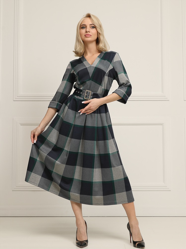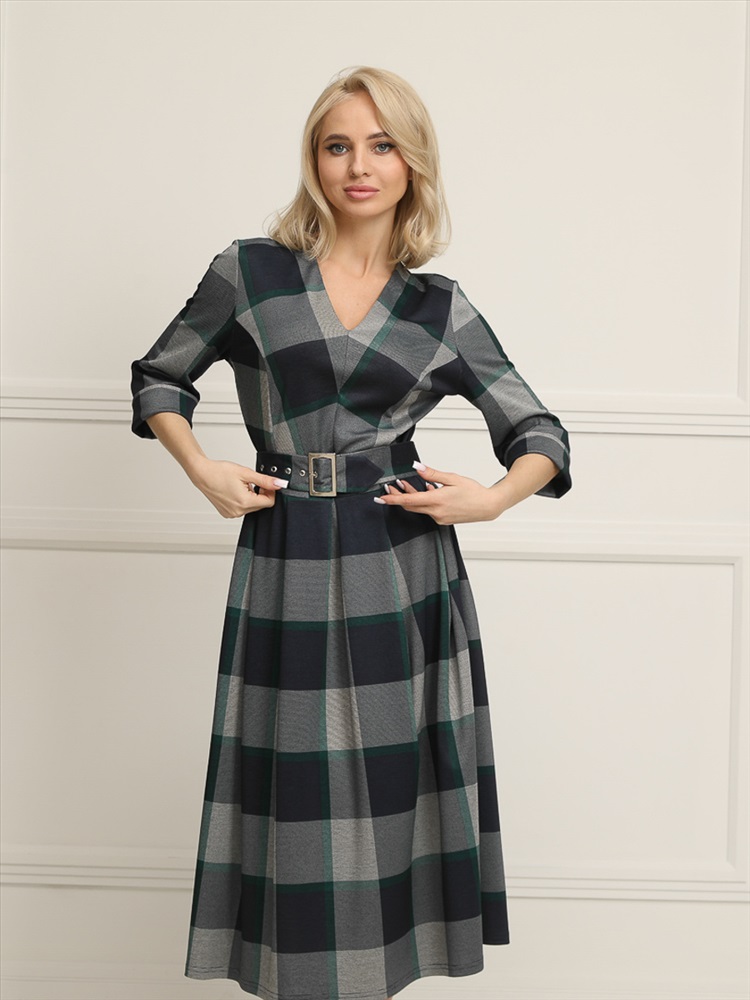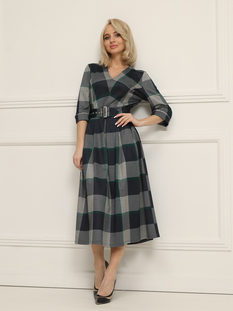 Обаятельное платье полуприлегающего силуэта их трикотажного полотна серо-зеленого цвета. V-образный вырез изделия обработан внутренней обтачкой Платье с втачными рукавами и отрезной юбкой, линия талии завышена. Юбка дополнена складками. В комплект входит пояс с металлической пряжкой. Длина изделия по спинке от плечевого шва до низа изделия — 117 см. Рост фотомодели — 170 см.