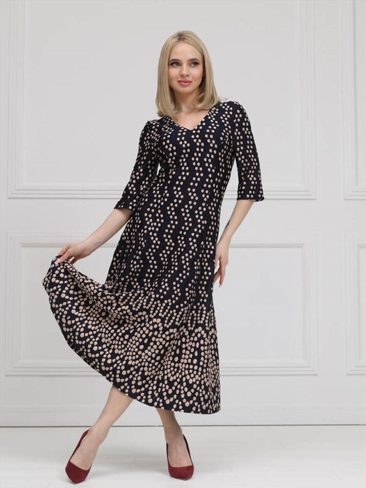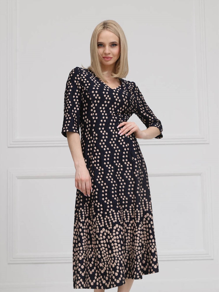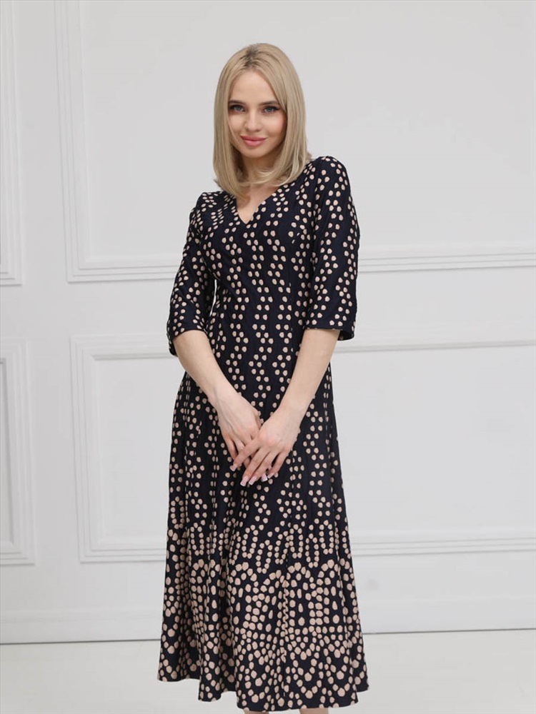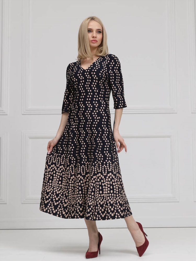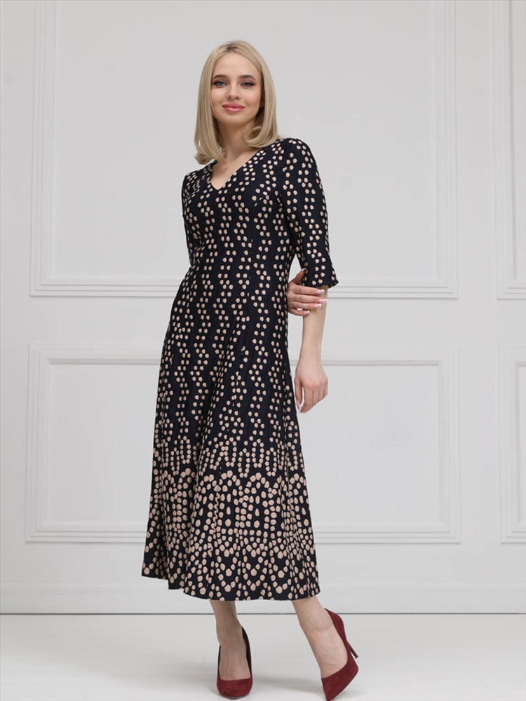 Женственное платье прилегающего силуэта из трикотажного полотна сине-бежевого цвета. V-образный вырез изделия обработан внутренней обтачкой. Платье с втачными рукавами. Длина изделия по спинке от плечевого шва до низа изделия — см. Рост фотомодели - 170 см.