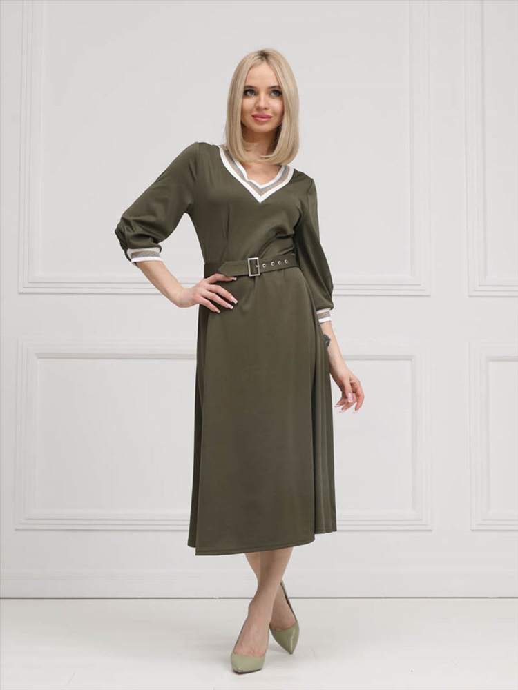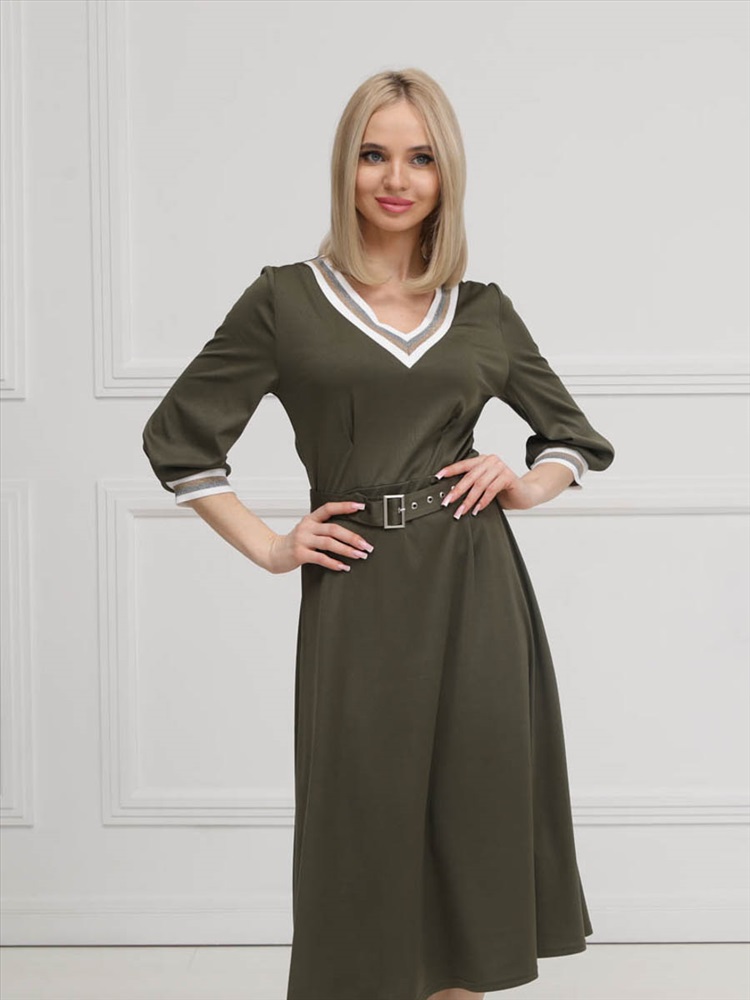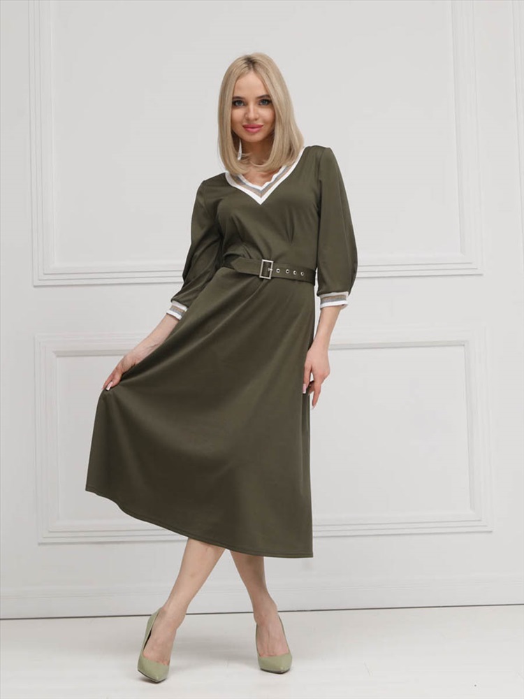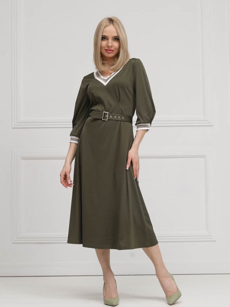 ШтрихКод: 4620306117750 По размеру: 46, 54, 56 Состав: Полиэстер 95% Эластан 5% Срок готовности: 2025-02-03T00-00-00 Эффектное платье полуприлегающего силуэта из трикотажного полотна цвета хаки. V-образный вырез изделия и втачные рукава обработаны трикотажными подвязами. Платье отрезное по линии талии. Перед изделия дополнен складками. В комплект входит пояс с металлической пряжкой. Длина изделия по спинке от плечевого шва до низа изделия — см. Рост фотомодели — 170 см. Комментарии к товару