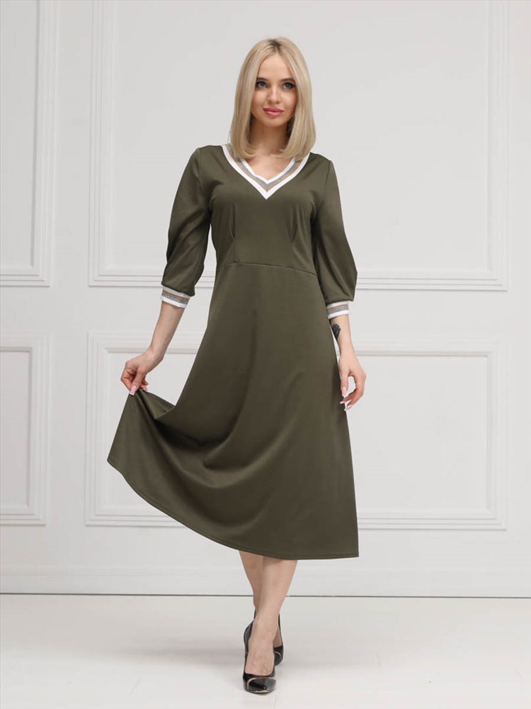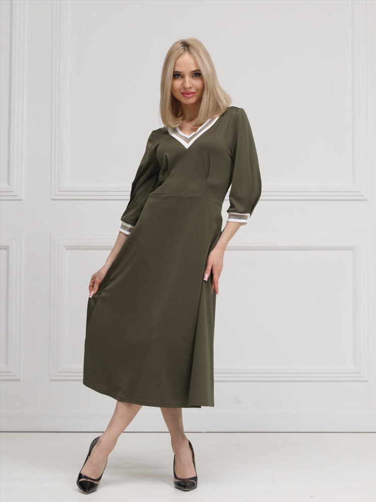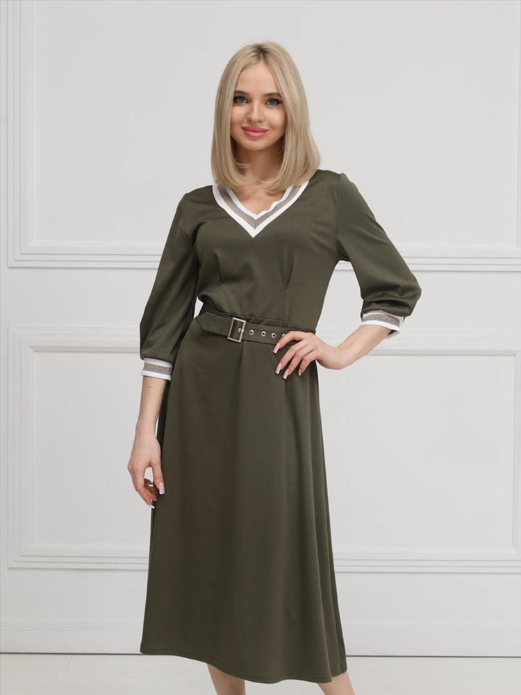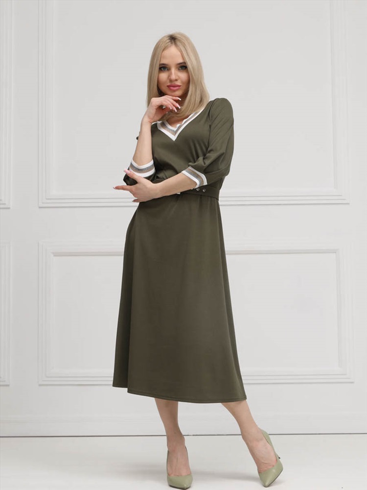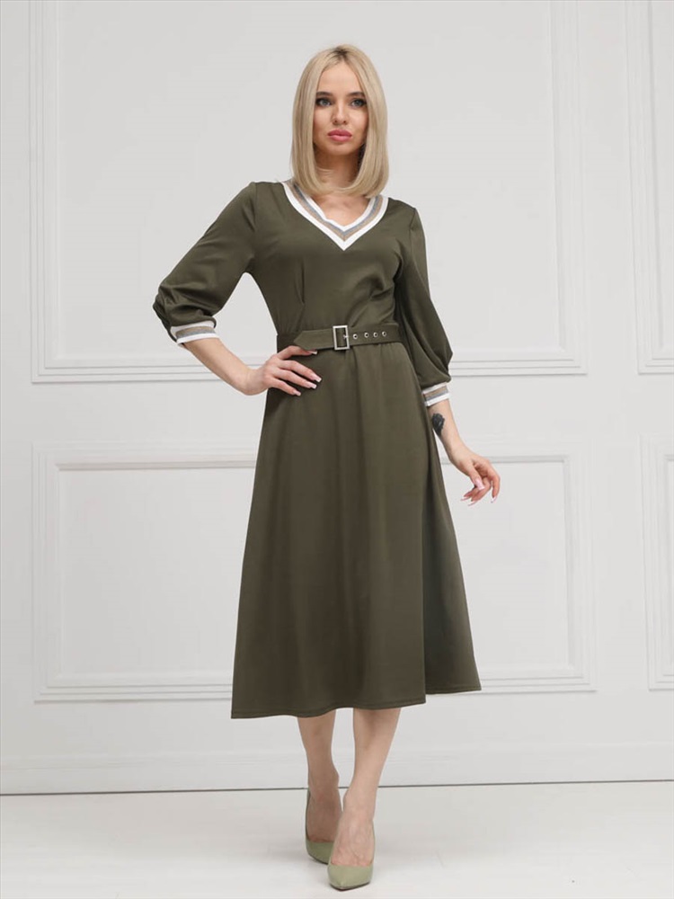 ШтрихКод: 4620306117750 По размеру: 46, 54, 56 Состав: Полиэстер 95% Эластан 5% Срок готовности: 2025-02-03T00-00-00 Эффектное платье полуприлегающего силуэта из трикотажного полотна цвета хаки. V-образный вырез изделия и втачные рукава обработаны трикотажными подвязами. Платье отрезное по линии талии. Перед изделия дополнен складками. В комплект входит пояс с металлической пряжкой. Длина изделия по спинке от плечевого шва до низа изделия — см. Рост фотомодели — 170 см. Комментарии к товару