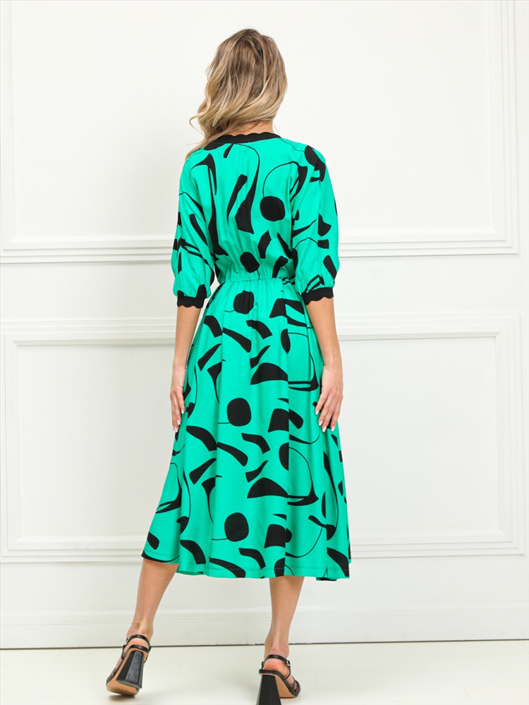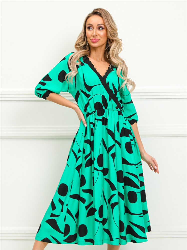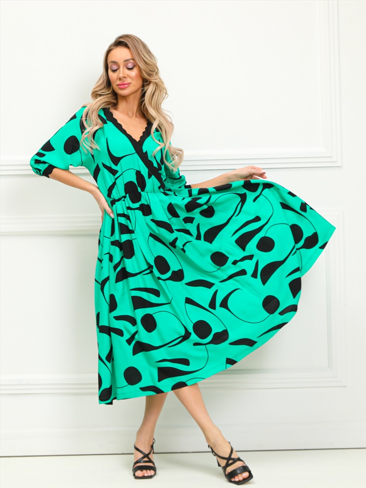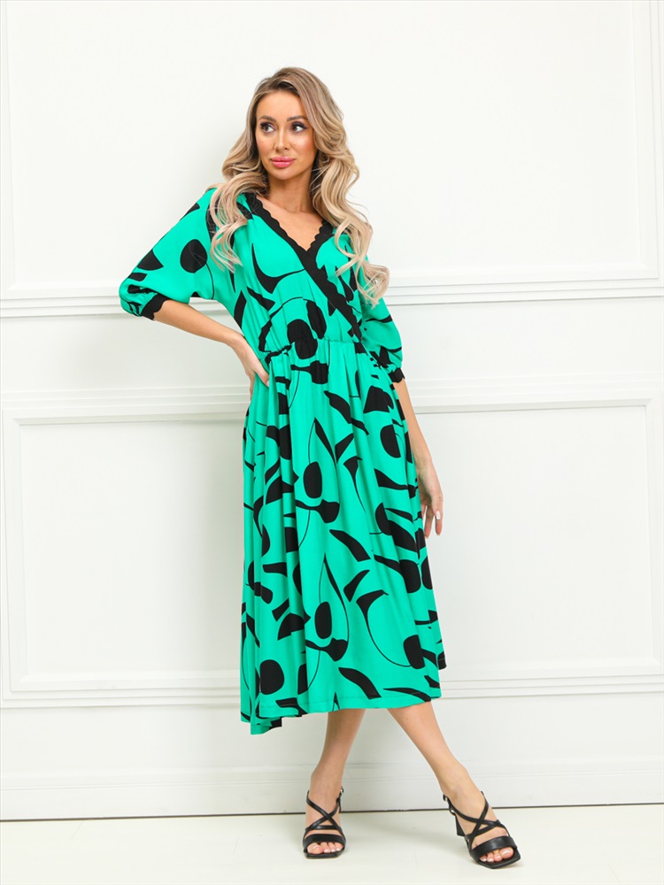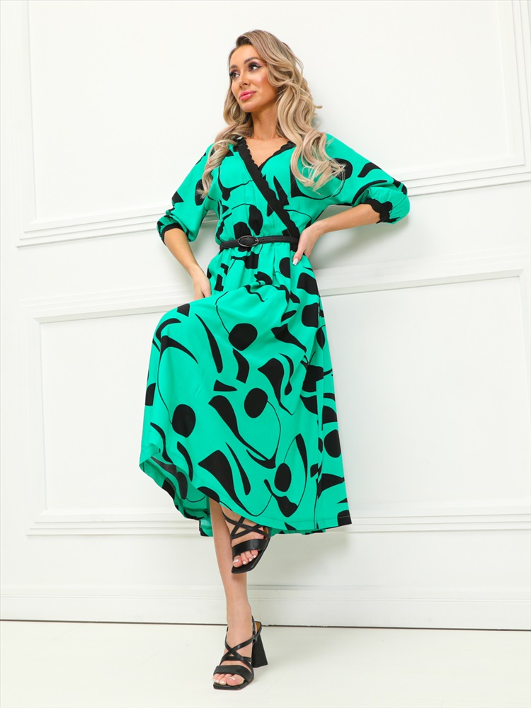 Очаровательное платье полуприлегающего силуэта из текстильной ткани зелено-черного цвета. Верхняя часть переда выполнена в форме запаха и дополнена трикотажным подвязом. Линия талии подчеркнута внутренним швом с резинкой. Цельнокроеные рукава обработаны трикотажными подвязами. Ремень в комплект не входит. Длина изделия по спинке от плечевого шва до низа изделия - см. Рост фотомодели - 170 см.