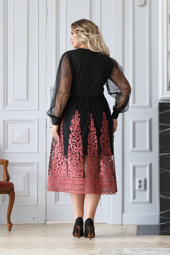 Нарядное платье полуприлегающего силуэта из трикотажного полотна черного цвета. Фигурный вырез изделия обработан внутренней обтачкой. Широкие втачные рукава выполнены из тонкой сетки и по низу дополнены эластичными манжетами. Изделие отрезное по линии талии. Низ платья двойной, верхний слой выполнен из роскошного кружева с вышивкой розового цвета. Спинка изделия дополнена застежкой на потайную молнию.