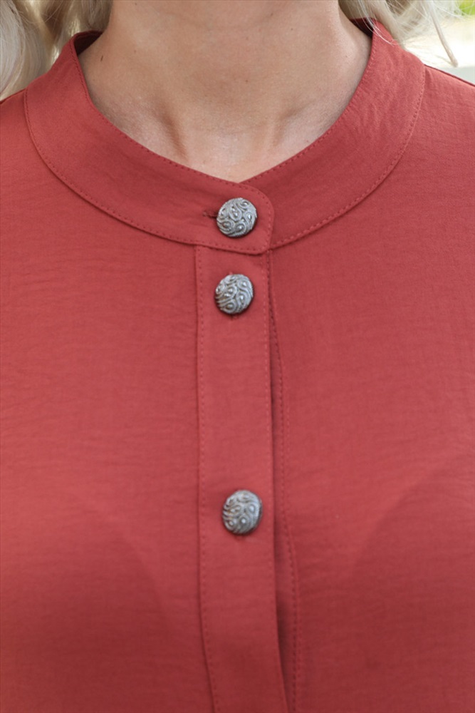Стильное платье свободного силуэта из текстильного полотна цвета терракот. Круглый вырез изделия обработан воротником-стойкой. По переду изделия выполнена планка с застежкой на пуговицы. Юбка дополнена широкими оборками. Втачные рукава дополнены вставками из кружева. Длина изделия по спинке от плечевого шва до низа изделия — 98 см. Рост фотомодели — 170 см.