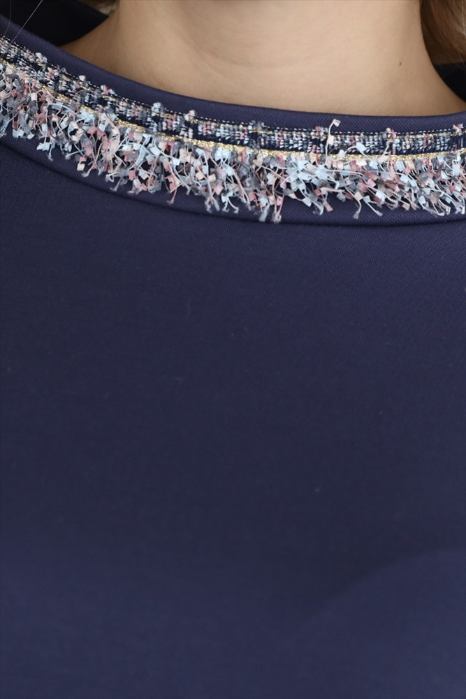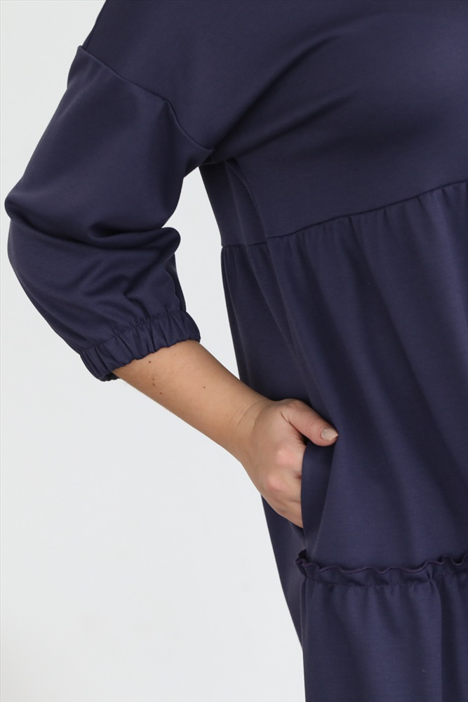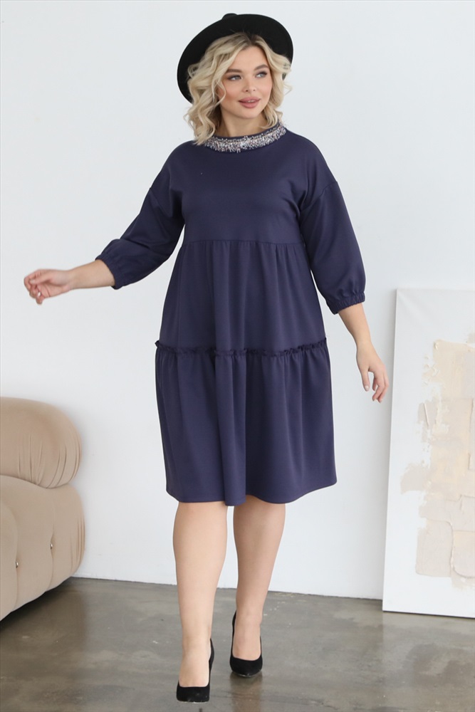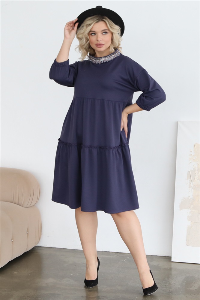 Романтичное платье А-силуэта из трикотажного полотна синего цвета. Воротник-полустойка эффектно дополнен тесьмой. Платье со спущенной проймой и втачными рукавами. Платье отрезное от линии груди, юбка выполнена из воланов и дополнена декоративной отстрочкой. Низ рукава обработан внутренней резинкой. Длина изделия по спинке от плечевого шва до низа изделия — 103 см. Аксессуары в комплект не входят. Рост фотомодели — 170 см.
