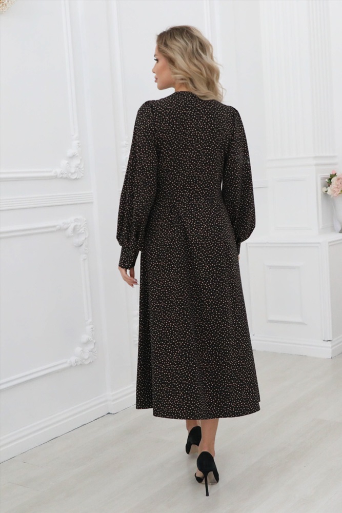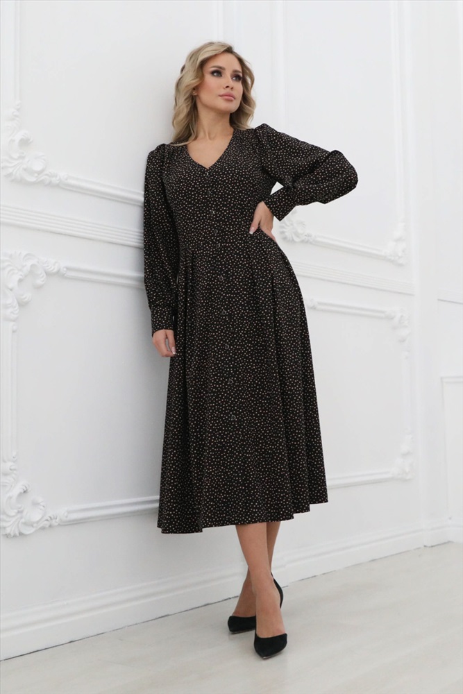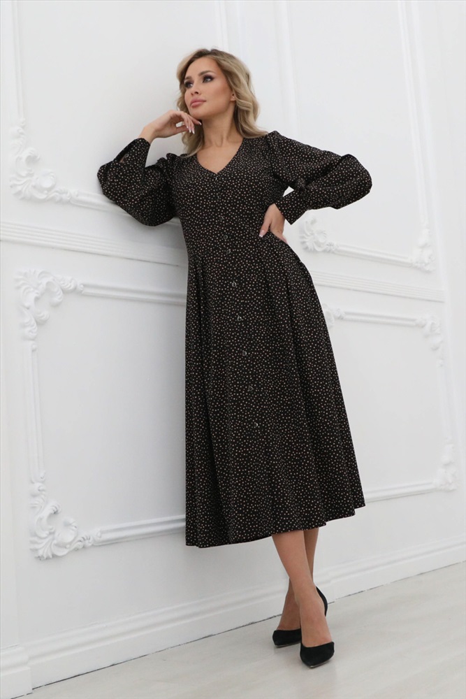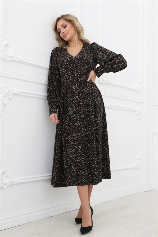 Эффектное платье свободного силуэта из текстильной ткани. V-образный вырез обработан внутренней обтачкой. Втачные рукава обработаны манжетами. По переду изделия выполнена планка с застежкой на пуговицы. Длина изделия по спинке от плечевого шва до низа изделия — 121 см. Аксессуары в комплект не входят. Рост фотомодели — 170 см.