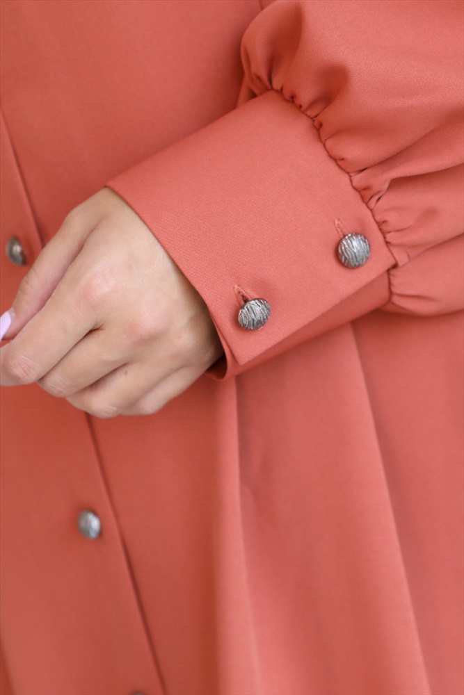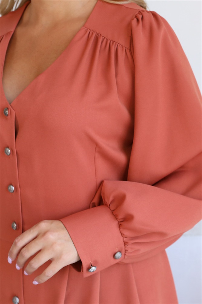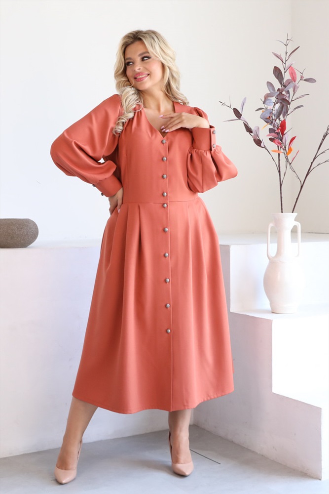 Эффектное платье свободного силуэта из текстильной ткани. V-образный вырез обработан внутренней обтачкой. Втачные рукава обработаны манжетами. По переду изделия выполнена планка с застежкой на пуговицы. Длина изделия по спинке от плечевого шва до низа изделия — 121 см. Аксессуары в комплект не входят. Рост фотомодели — 170 см.