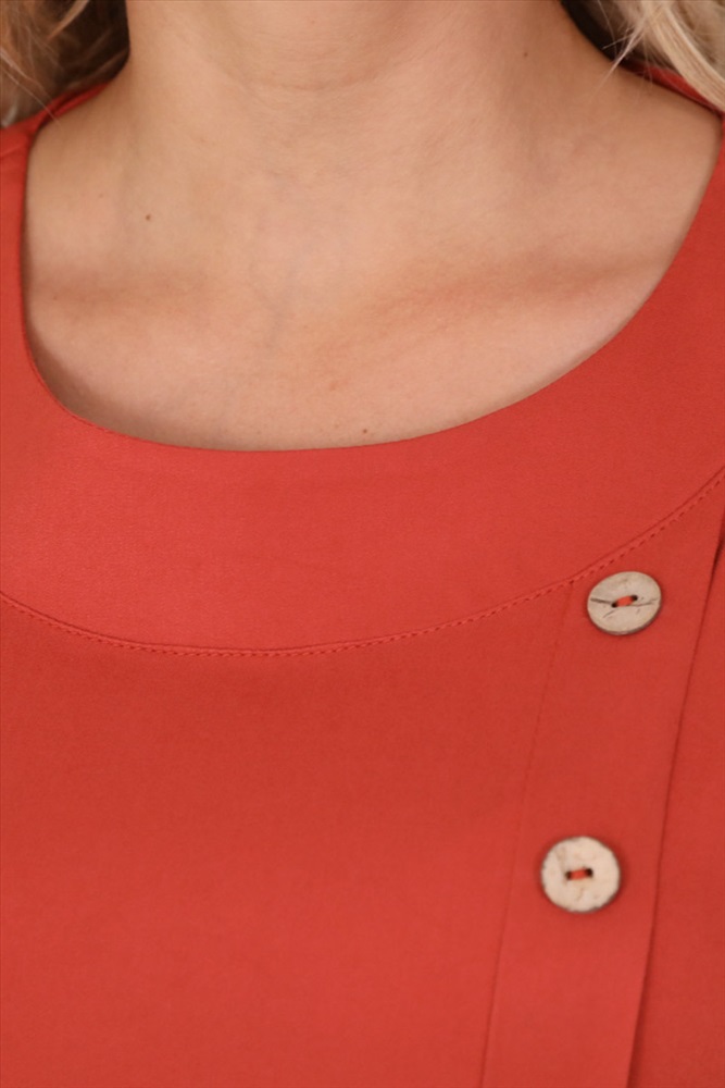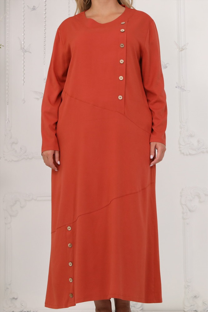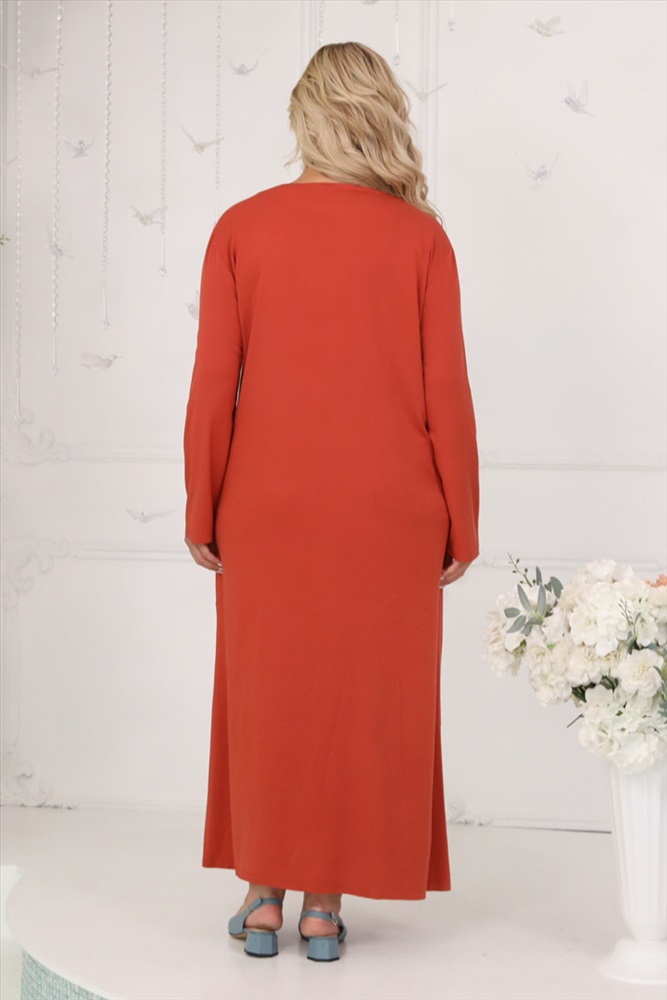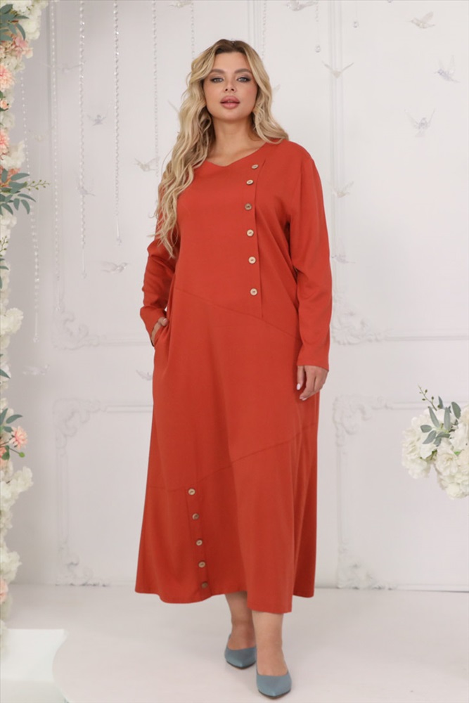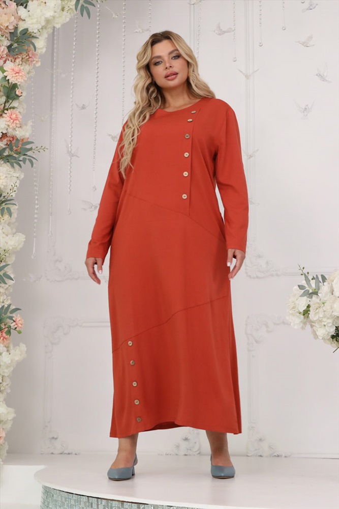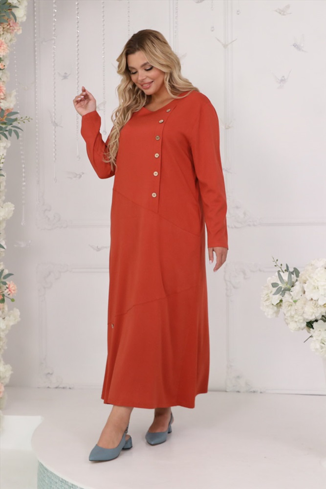 Роскошное платье прямого силуэта из текстильной ткани терракотового цвета. Круглый вырез изделия обработан внешней обтачкой. Платье с втачными рукавами. По переду издедия выполнена планка с декоративными пуговицами. Длина изделия по спинке от плечевого шва до низа изделия — 135 см. Рост фотомодели - 170 см.