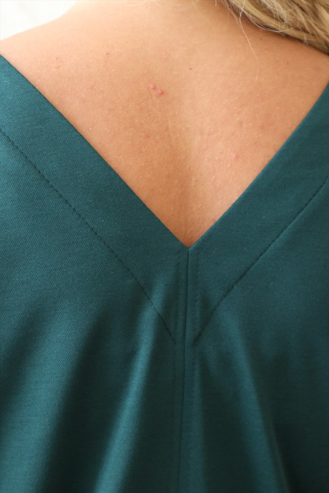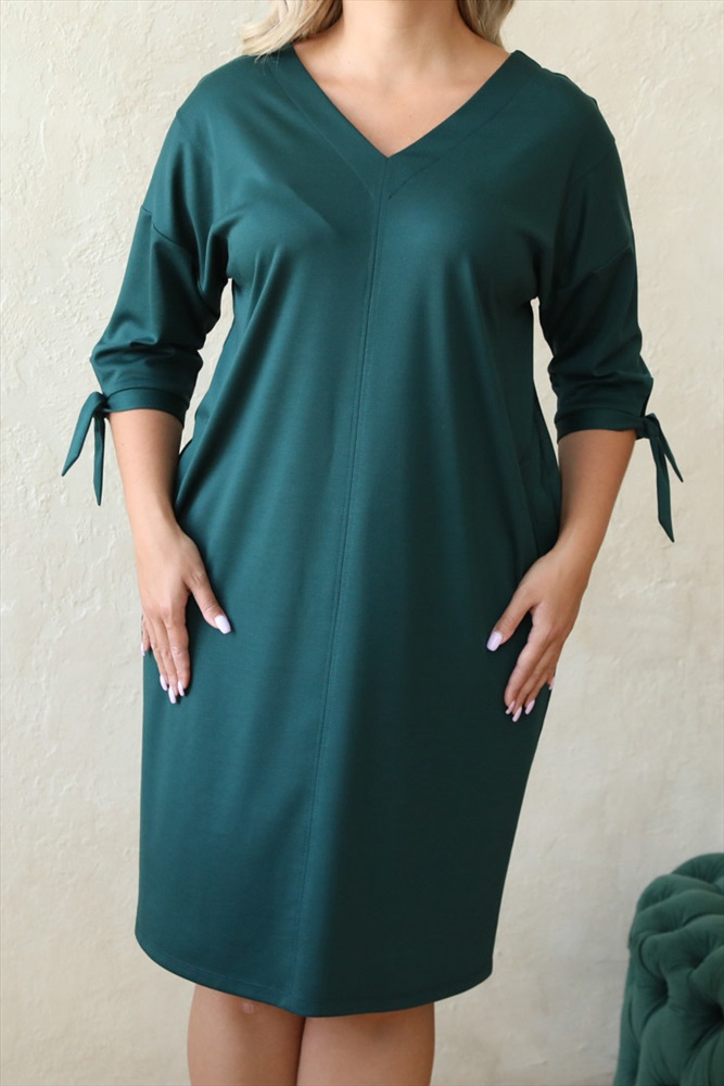 Женственное платье полуприлегающего силуэта из трикотажного полотна зеленого цвета. V-образный вырез изделия обработан внутренней обтачкой. Платье со спущенной проймой, втачные рукава обработаны манжетами с завязками. По переду изделия внутренние карманы. Длина изделия по спинке от плечевого шва до низа изделия - 102 см. Рост фотомодели — 170 см.