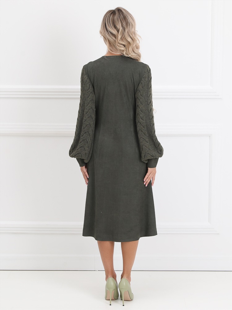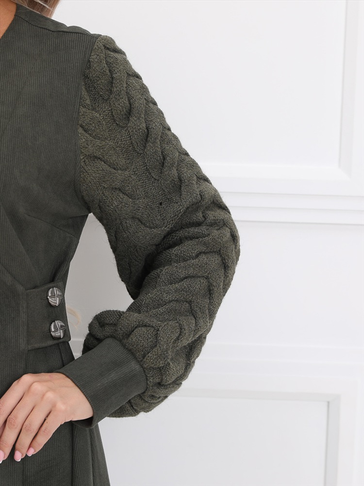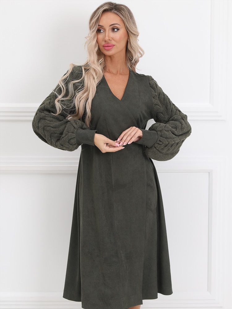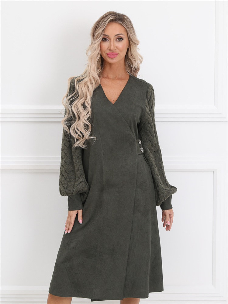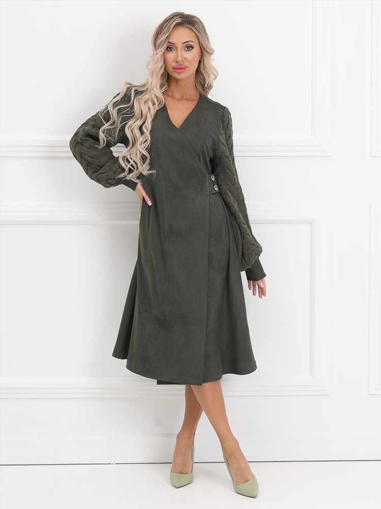 Обаятельное платье полуприлегающего силуэта из трикотажного вельвета. Перед изделия выполнен в форме запаха. Сбоку изделия застежка на кнопки. Втачные рукава выполнены в технике ручного вязания и обработаны манжетами. Длина изделия по спинке от плечевого шва до низа изделия — 111 см. Рост фотомодели — 170 см.