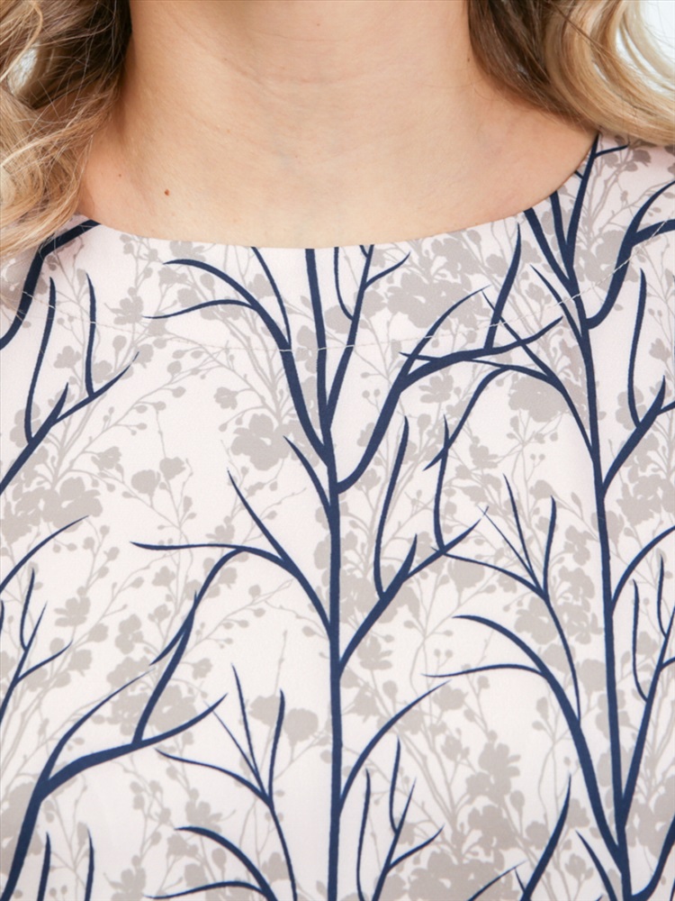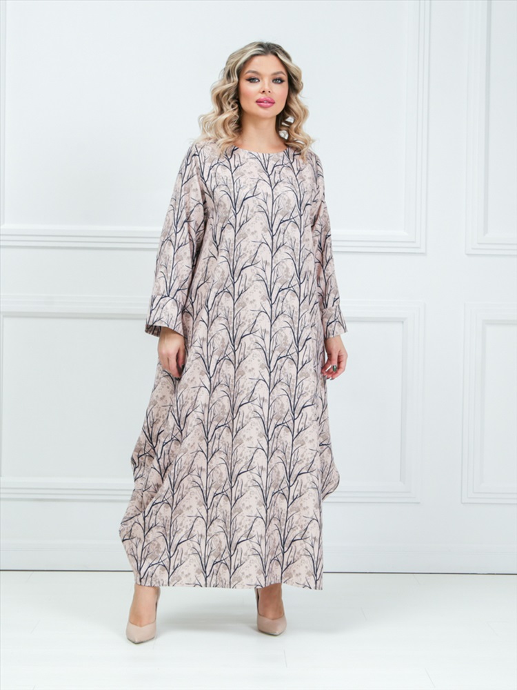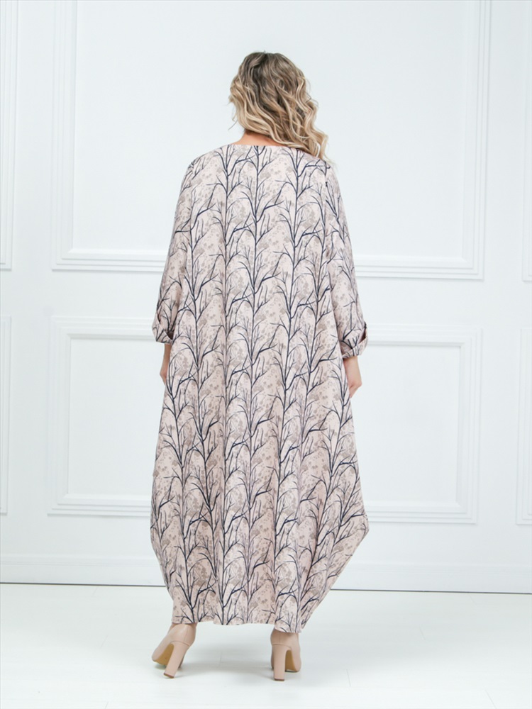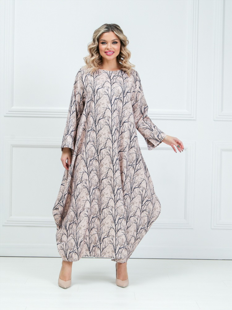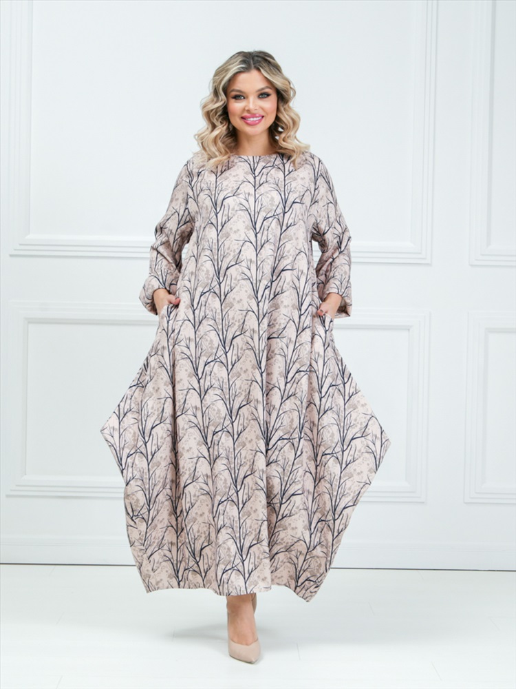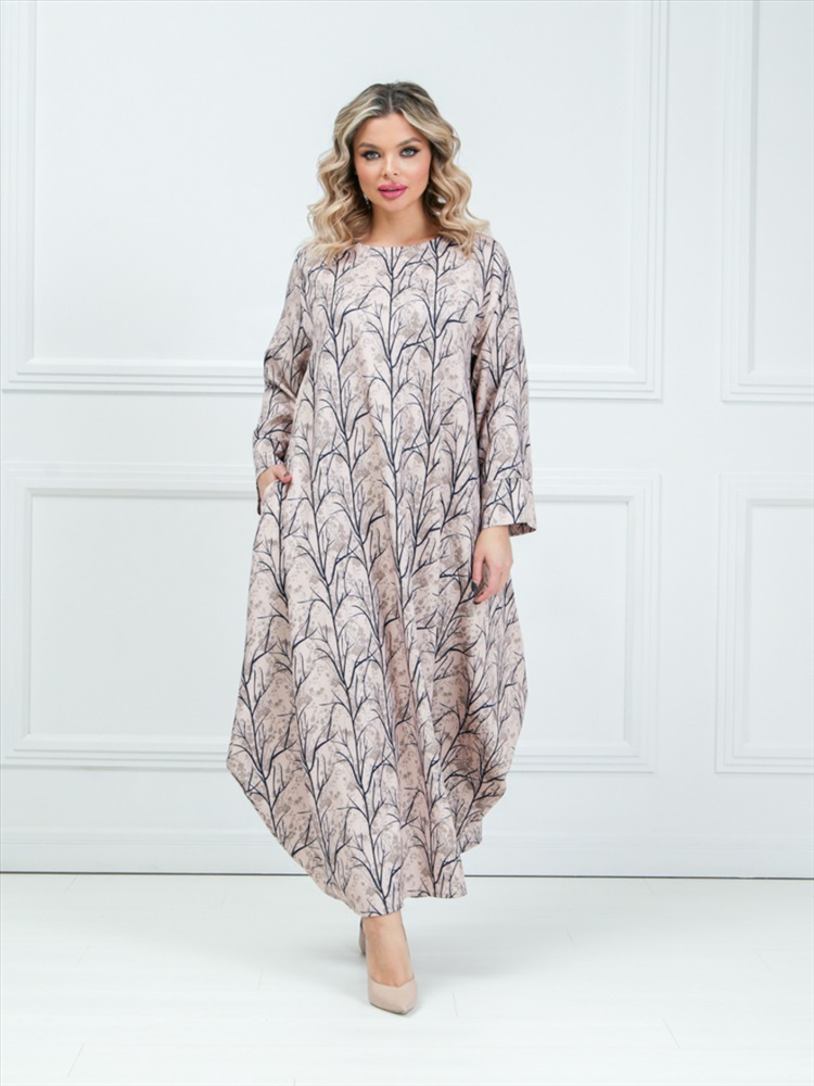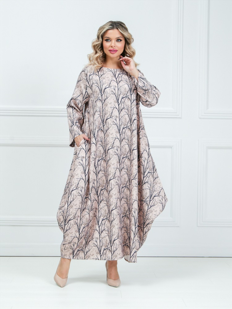 Эффектное платье свободного силуэта из текстильной ткани розового цвета с купонным рисунком. Круглый вырез изделия обработан внутренней обтачкой. Платье со спущенной проймой и втачными рукавами. По бокам изделия — внутренние карманы. Длина изделия по спинке от плечевого шва до низа изделия - см. Рост фотомодели — 170 см
