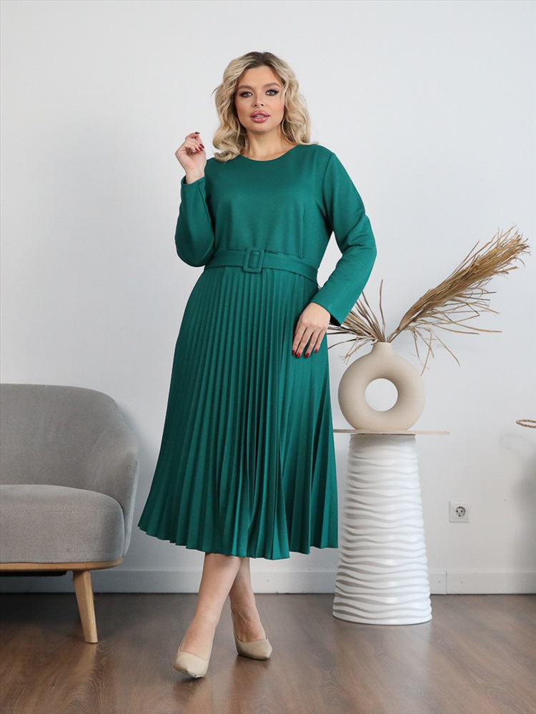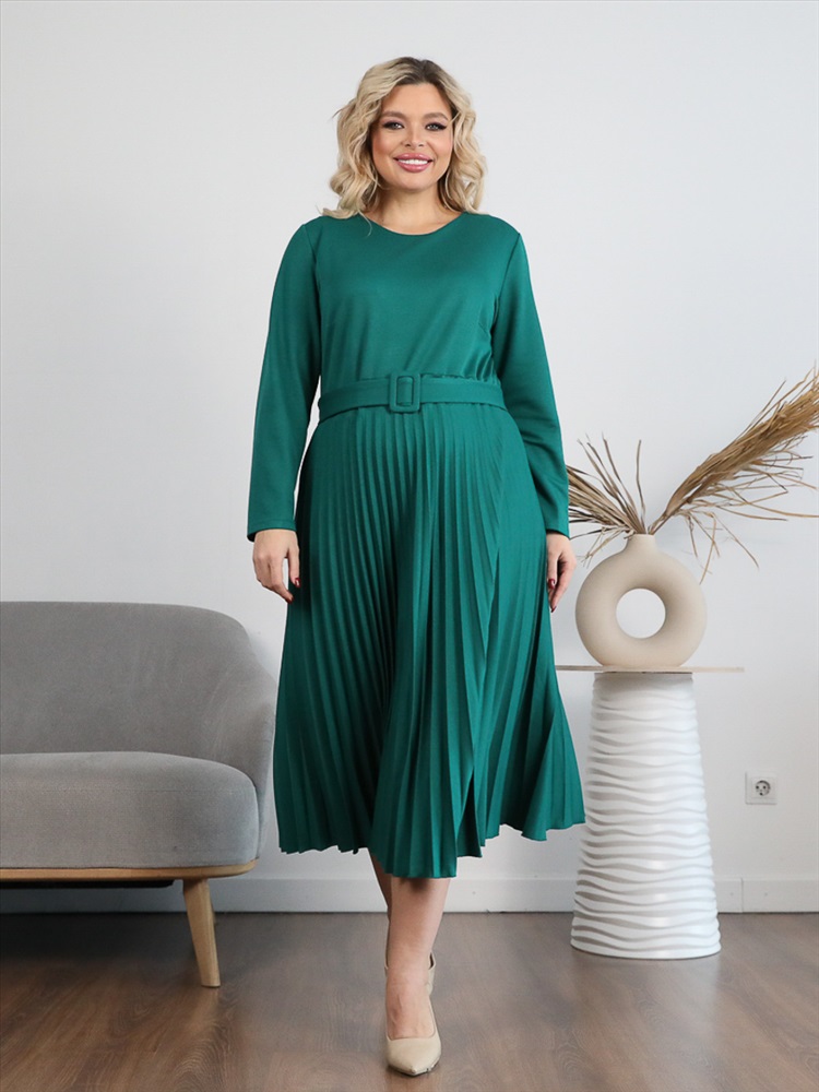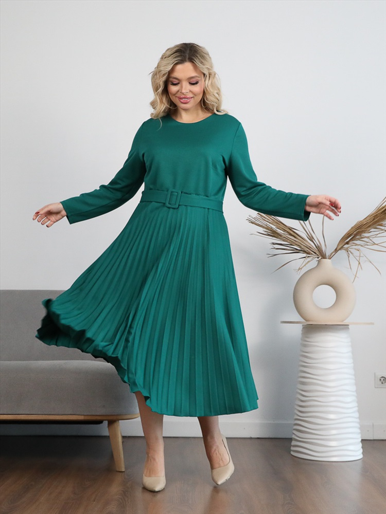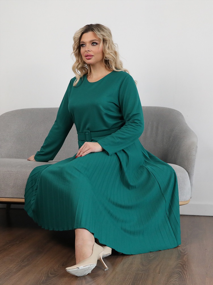 ШтрихКод: 4650333117812 По размеру: 48, 50, 52, 54 Состав: Вискоза 65% Полиэстер 30% Эластан 5% Скидка на сайте: Без скидки Срок готовности: 2023-12-20T00-00-00 Эффектное платье полуприлегающего силуэта из трикотажного полотна зеленого цвета. Круглый вырез изделия обработан внутренней обтачкой. Платье с втачными рукавами и отрезной юбкой. Юбка выполнена из гофрированного полотна. В комплект входит ремень. Длина изделия по спинке от плечевого шва до низа изделия — 114 см. Рост фотомодели 170 см. Комментарии к товару