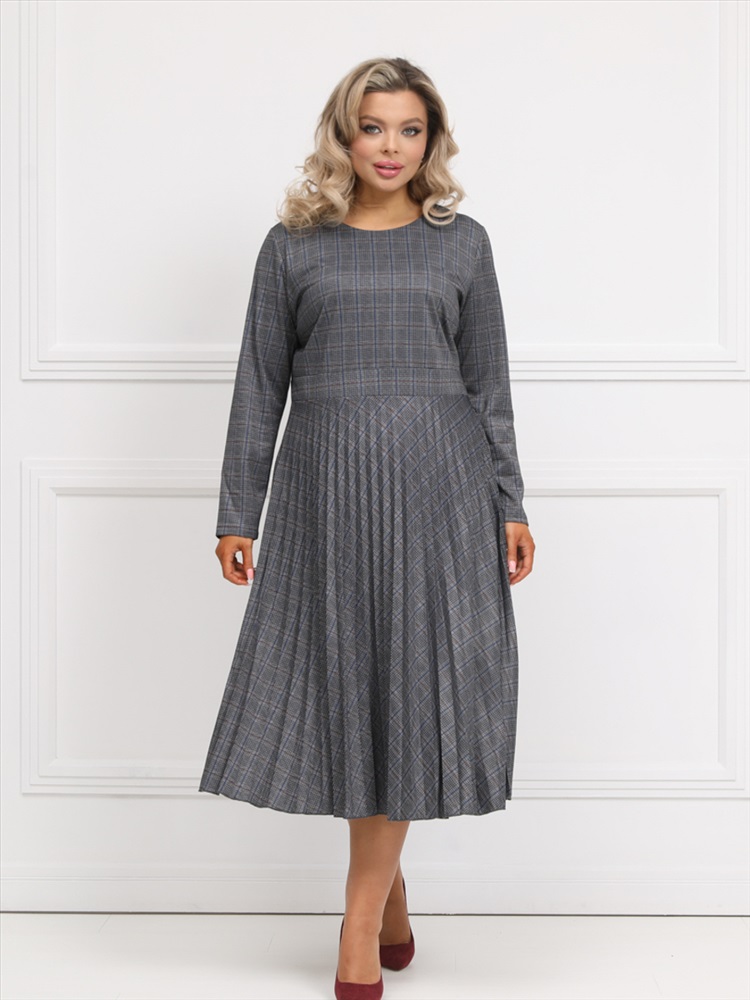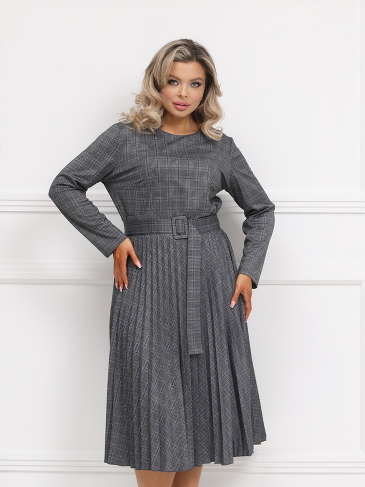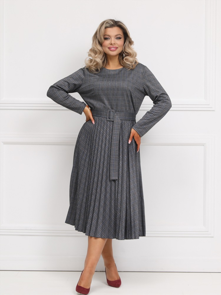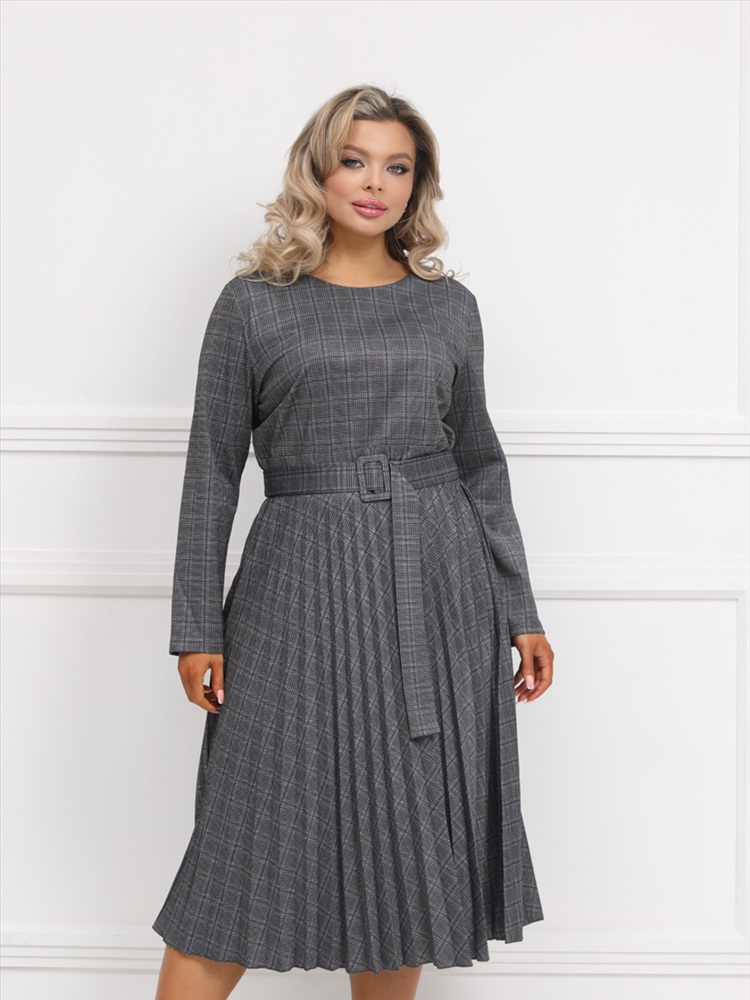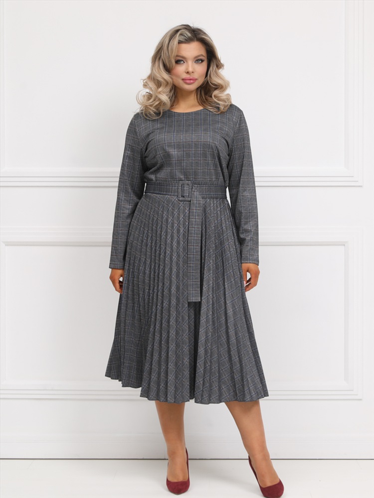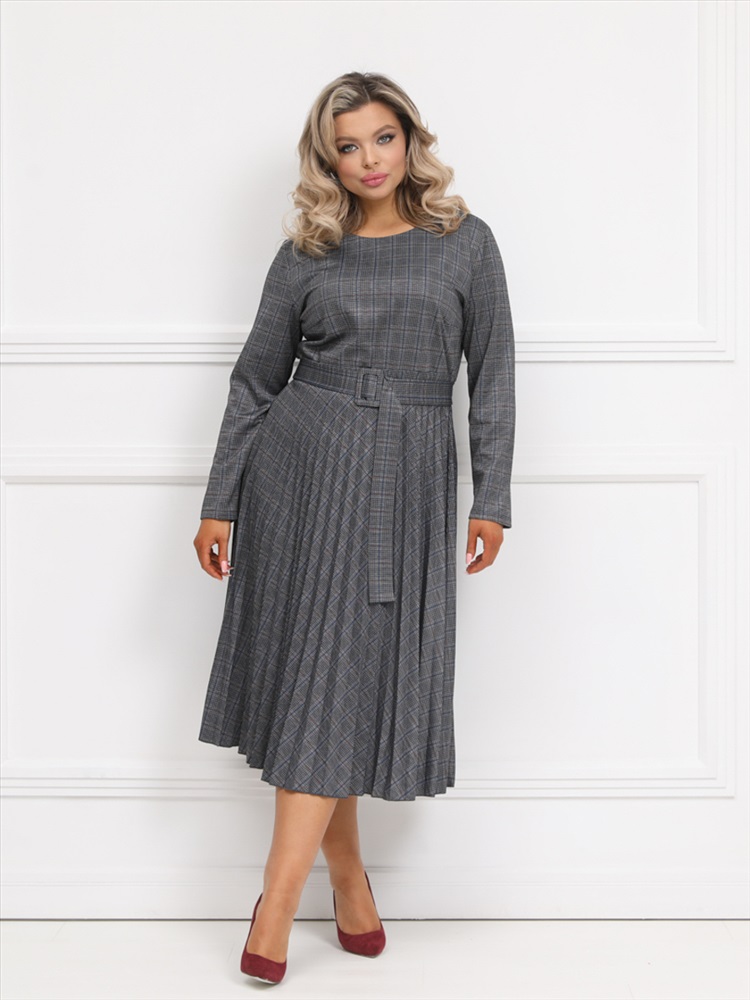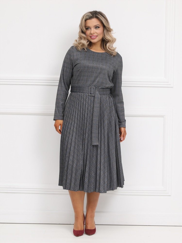 Эффектное платье полуприлегающего силуэта из трикотажного полотна серого цвета. Круглый вырез изделия обработан внутренней обтачкой. Платье с втачными рукавами и отрезной юбкой. Юбка выполнена из гофрированного полотна. В комплект входит ремень.