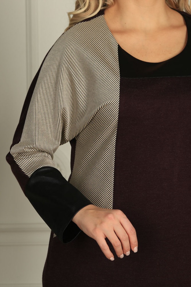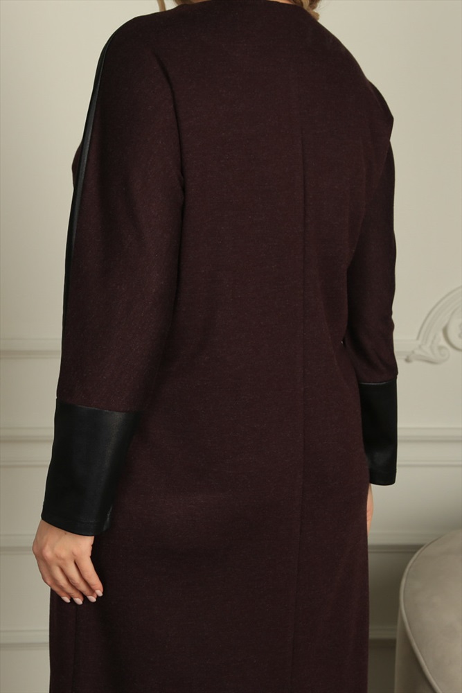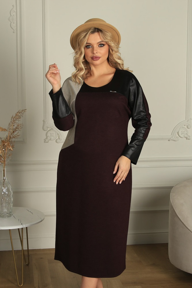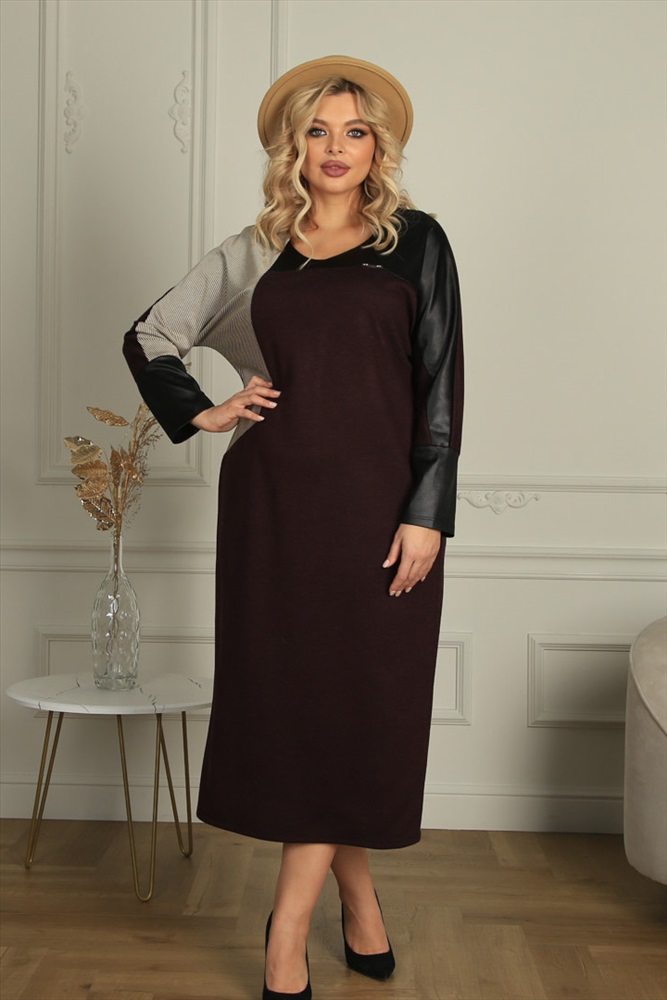 Стильное платье полуприлегающего силуэта из трикотажного полотна бордового цвета. Круглый вырез изделия обработан внутренней обтачкой. Отрезная кокектка дополнен декоративным элементом. Платье со спущенной проймой и втачными рукавами. Аксессуары в комплект не входят.