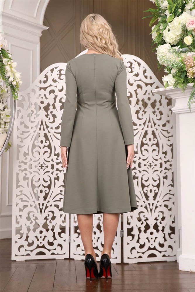 Стильное платье полуприлегающего силуэта из трикотажного полотна цвета хаки. Круглый вырез изделия обработан внутренней обтачкой и дополнен декоративным разрезом. Платье с втачными рукавами. Ремень в комплект не входит. Рекомендуем к платью серый ремень, артикул Р-79. Длина изделия по спинке от плечевого шва до низа изделия —108 см. Рост фотомодели -170 см.