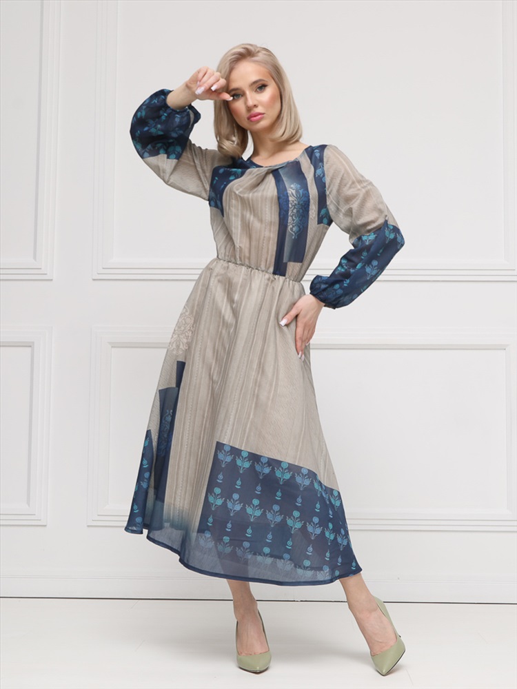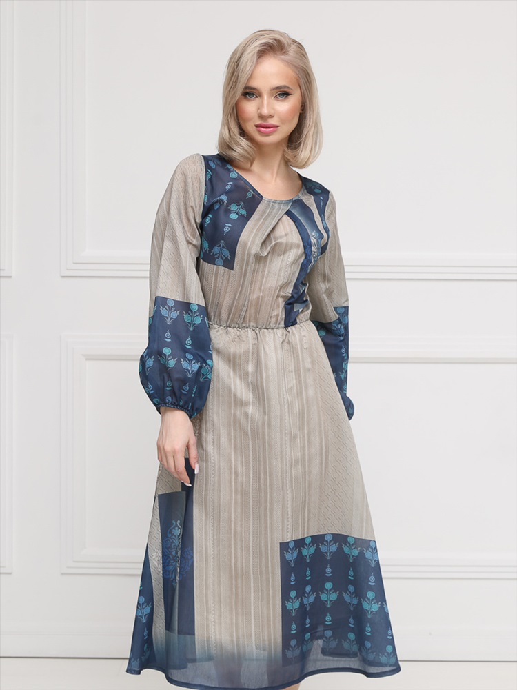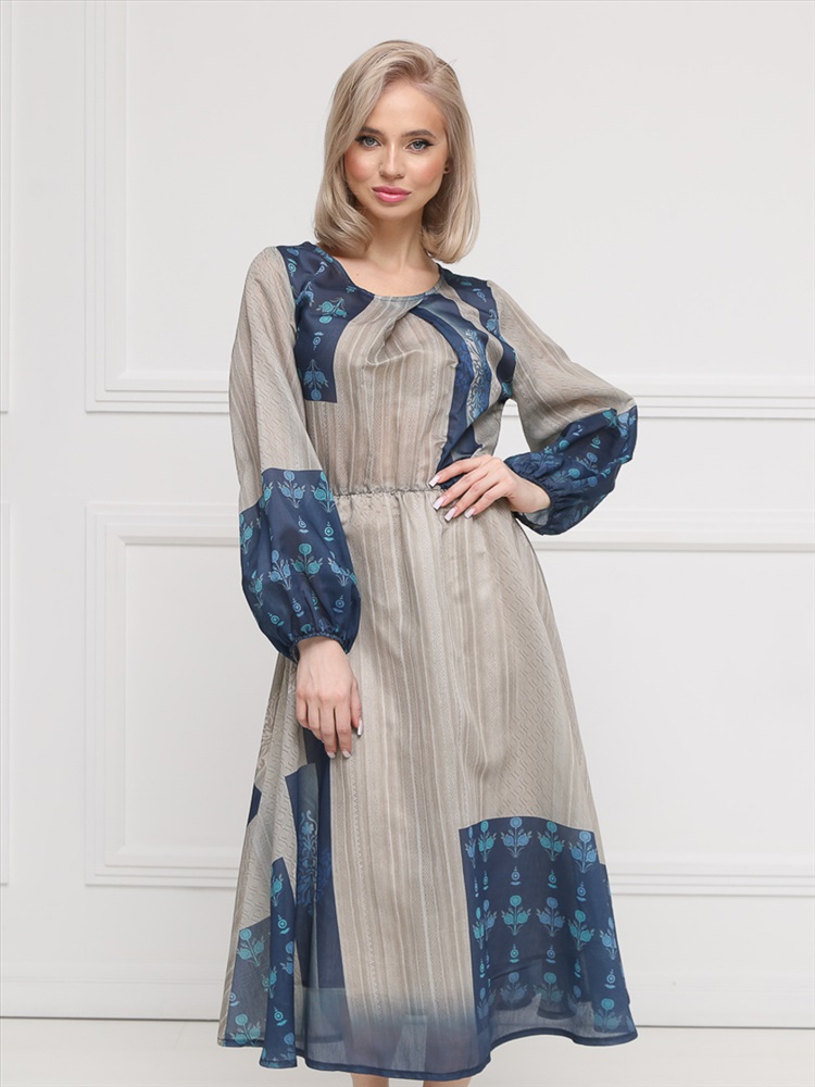 Роскошное платье полуприлегающего силуэта из текстильной ткани сине-бежевого цвета с купоным рисунком. Круглый вырез изделия обработан внутренней обтачкой. Перед изделия дополнен вертикальными складками. Линия талии эффекстно подчеркнута швом с резинкой. Втачные рукава обработаны окантовкой. Ремень в комплект не входит.Длина изделия по спинке от плечевого шва до низа изделия — 120 см. Рост фотомодели — 170 см.
