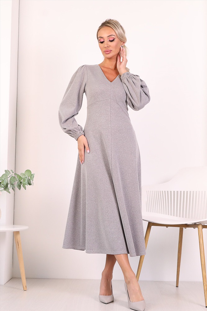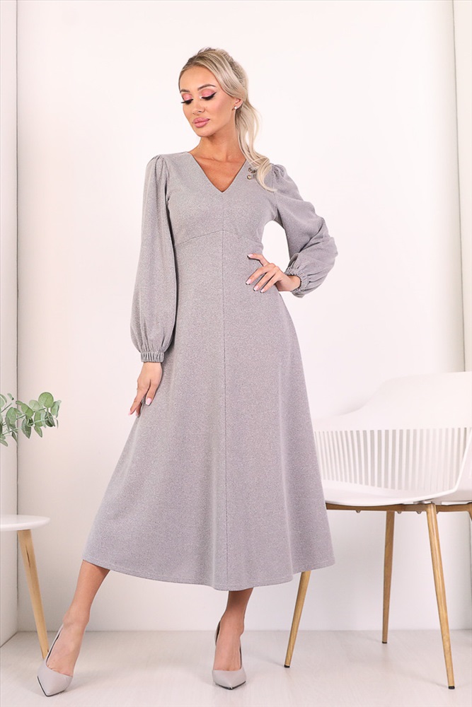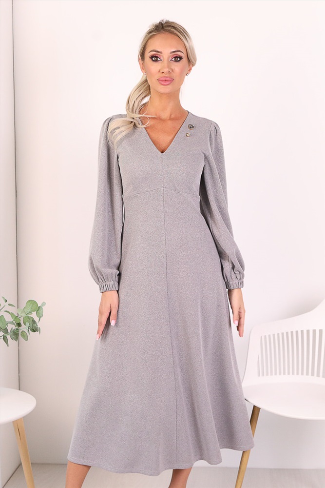 Изящное платье полуприлегающего силуэта из трикотажного полотна серого цвета. V-образный вырез изделия обработан внутренней обтачкой. Втачные рукава дополнены сборкой по линии плеча и обработаны манжетами. В комплект входит декоративный элемент в форме булавки. Длина изделия по спинке от плечевого шва до низа изделия — 122 см. Рост фотомодели — 170 см.