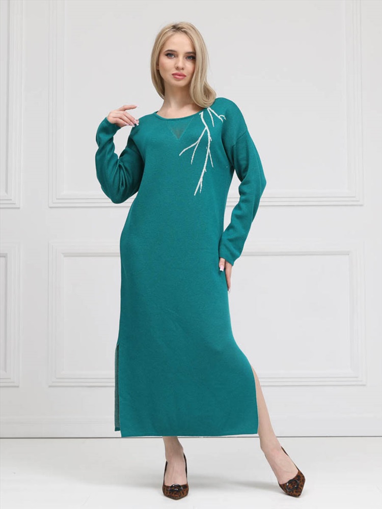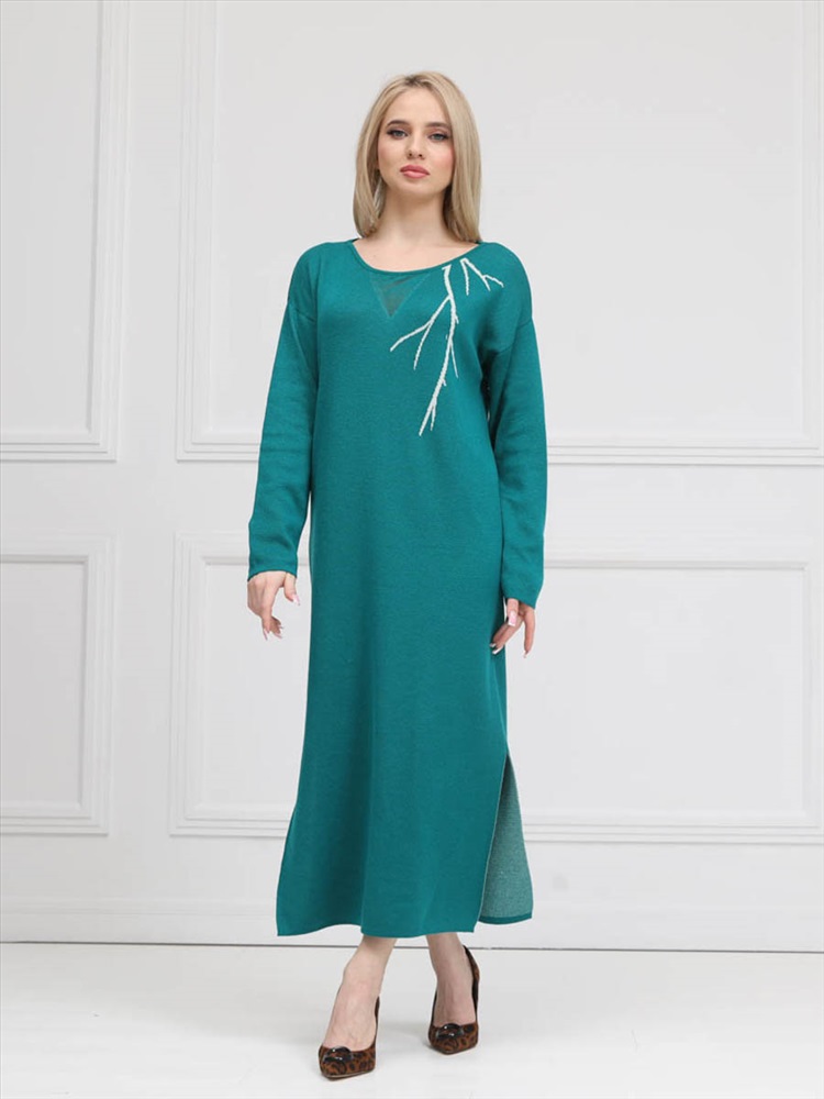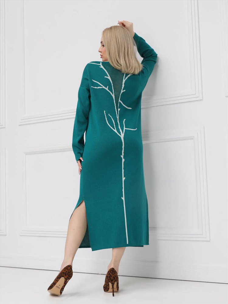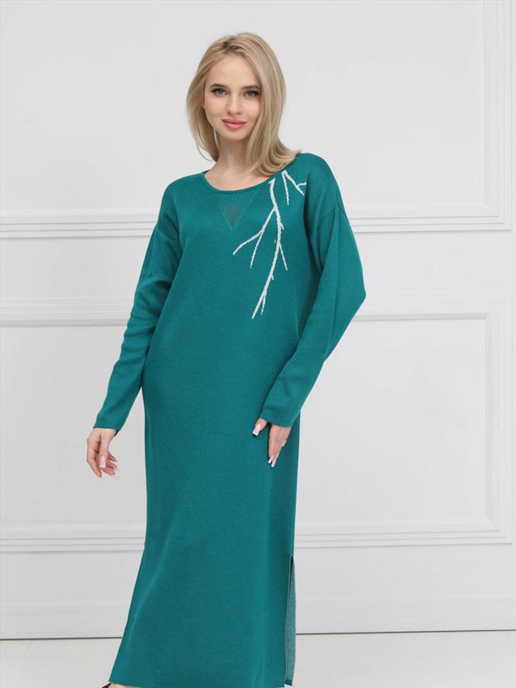 Стильное платье прямого силуэта. Платье выполнено из хлопковых нитей бирюзового цвета с тонким плотным переплетением. Круглый вырез обработан подвязом. Платья дополнено вывязанным контрастным рисунком. Длина изделия по спинке от плечевого шва до низа изделия — 120 см.