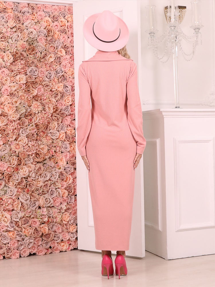 Стильное платье полуприлегающего силуэта из трикотажного полотна розового цвета. Платье с отложным воротником. Застежка по переду изделия на металлическую молнию. Платье со спущенной проймой и втачными рукавами. Длина изделия по спинке от плечевого шва до низа изделия — 129 см. Рост фотомодели — 170 см.
