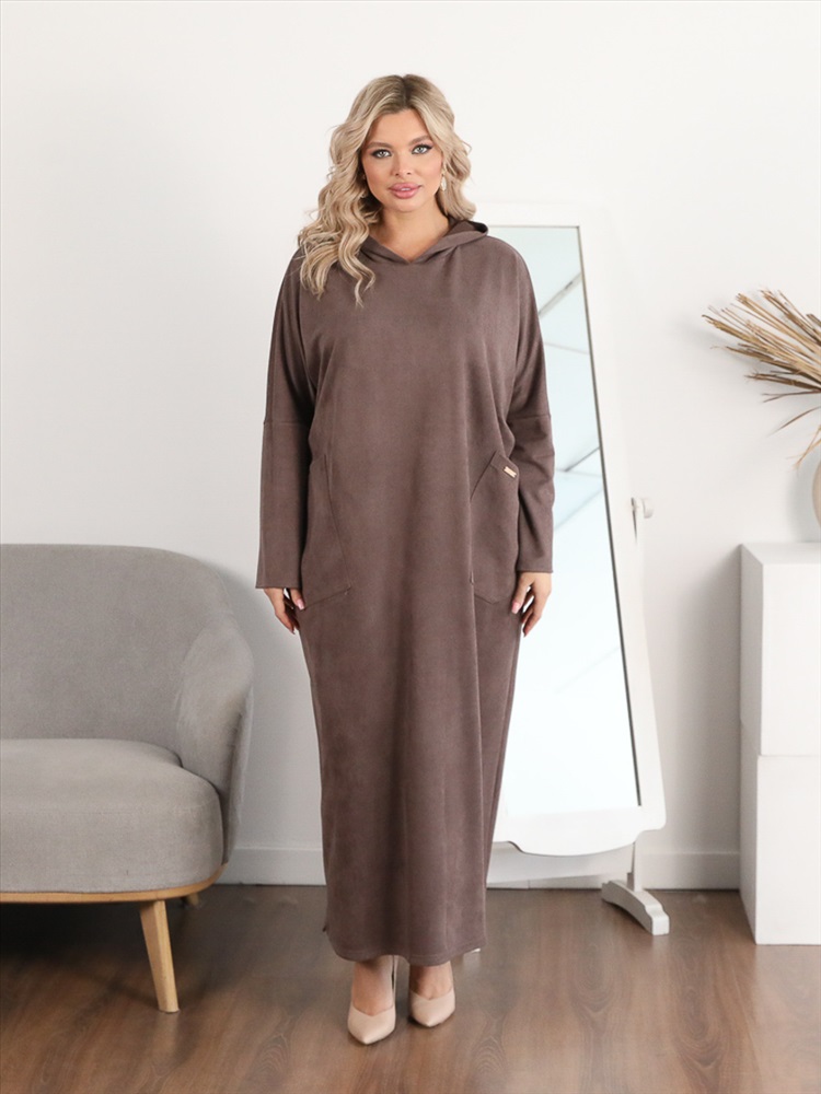 Эффектное платье свободного силуэта из текстильного полотна кофейного цвета. Круглый вырез изделия обработан капюшоном. Платье со спущенной проймой и втачными рукавами. Перед изделия дополнен накладными карманами. По бокам изделия - разрезы. Длина платья по спинке от плечевого шва до низа изделия — 128 см.