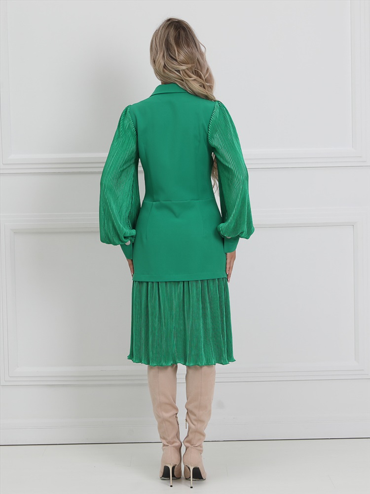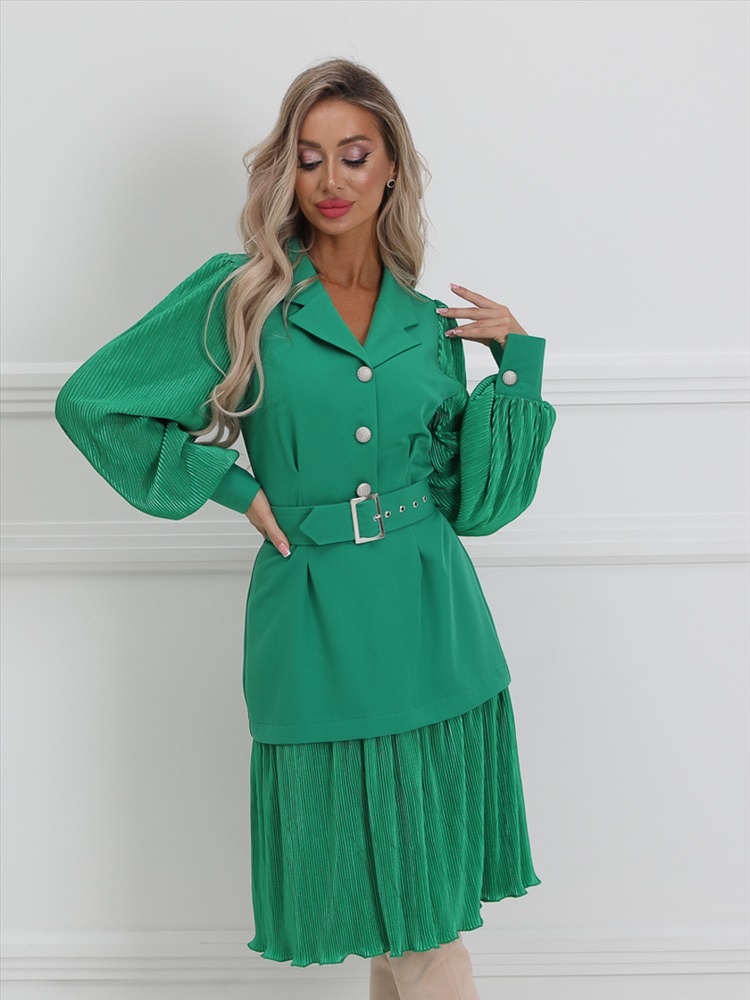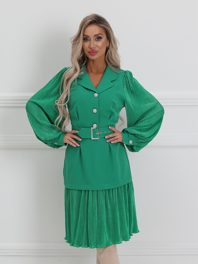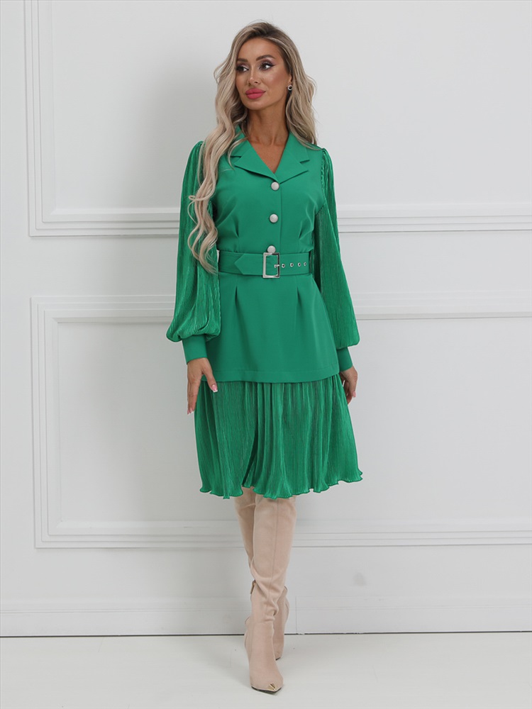 Роскошное платье прямого силуэта из текстильной ткани зеленого цвета. Платье с отложным воротником. Верхняя часть переда дополнена застежкой на пуговицы. Втачные рукава выполнены из плиссированной ткани и обработаны манжетами с застежкой на пуговицу. По низу изделия широкая оборка из плиссированной ткани. В комплект входит пояс с металлической пряжкой. Длина изделия по спинке от плечевого шва до низа изделия - 100 см. Рост фотомодели 170 см.