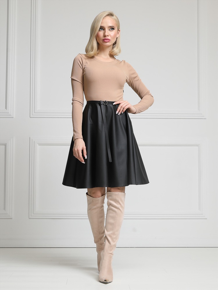 ШтрихКод: 4620306110560 По размеру: 42, 44, 46, 48 Состав: Вискоза 95% Эластан 5% Срок готовности: 2024-11-08T00-00-00 Обаятельное платье прилегающего силуэта из трикотажного полотна коричнево-черного цвета. Верхняя часть изделия выполнена из трикотажного полотна, а юбка из эко-кожи. Круглый вырез изделия обработан внешней обтачкой. Платье с втачными рукавами. В комплект входи ремень. Длина изделия по спинке от плечевого шва до низа изделия — см. Рост фотомодели - 170 см. Комментарии к товару