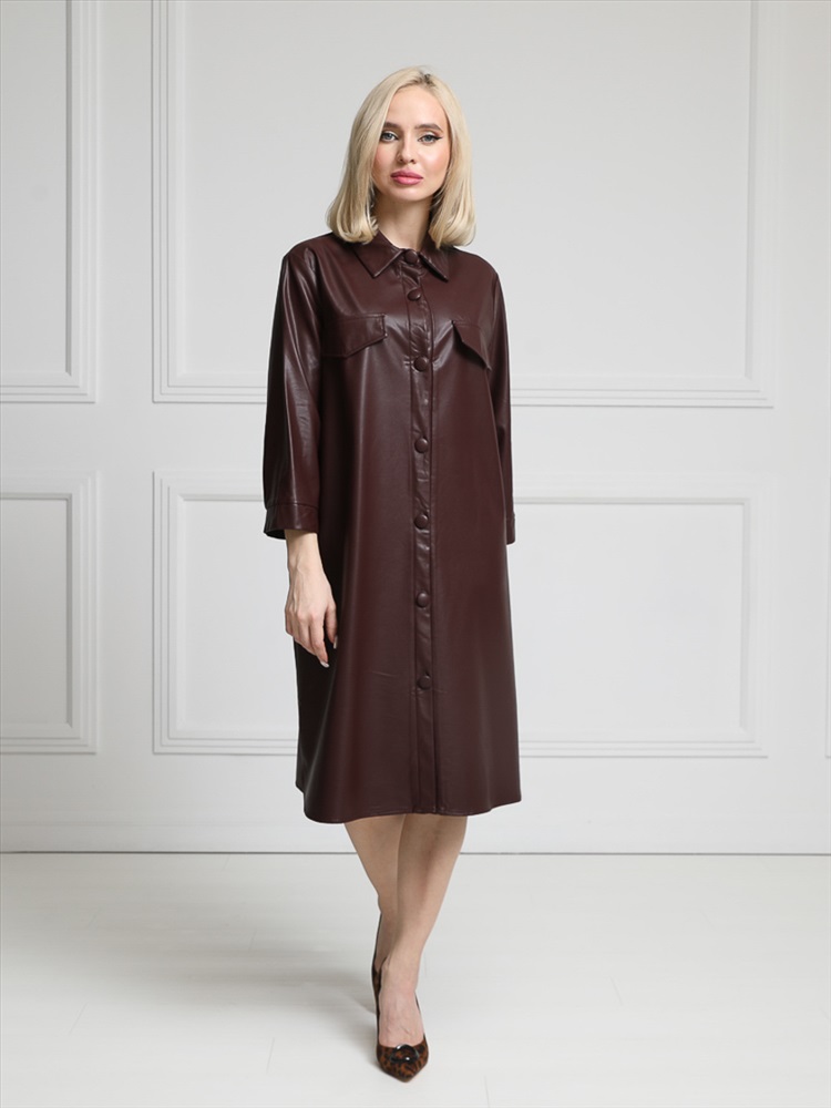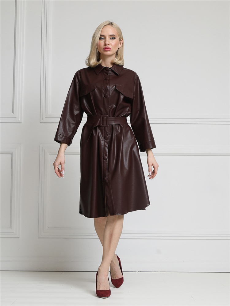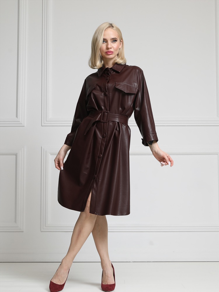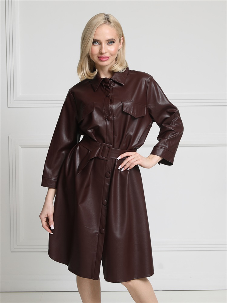 Срок готовности: 2024-11-08T00-00-00 Стильное платье прямого силуэта из эко-кожи на трикотажной основе цвета марсала. Круглый вырез изделия обработан отложным воротником. Перед изделия дополнен клапанами с пуговицами. Втачные рукава обработаны манжетами. По переду изделия планка с застежкой на пуговицы. По бокам изделия - разрезы. В комплект входит пояс. Длина изделия по спинке от плечевого шва до низа изделия — см. Рост фотомодели - 170 см.