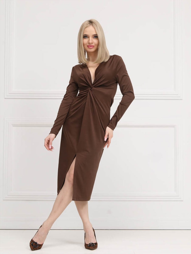 Роскошное платье прилегающего силуэта из трикотажного полотна коричневого цвета. V-образный вырез обработан окантовкой и дополнен декоративным перекрутом. Платье с втачными рукавами. Перед дополнен вырезом. Длина изделия по спинке от плечевого шва до низа изделия — см. Рост фотомодели — 170 см.