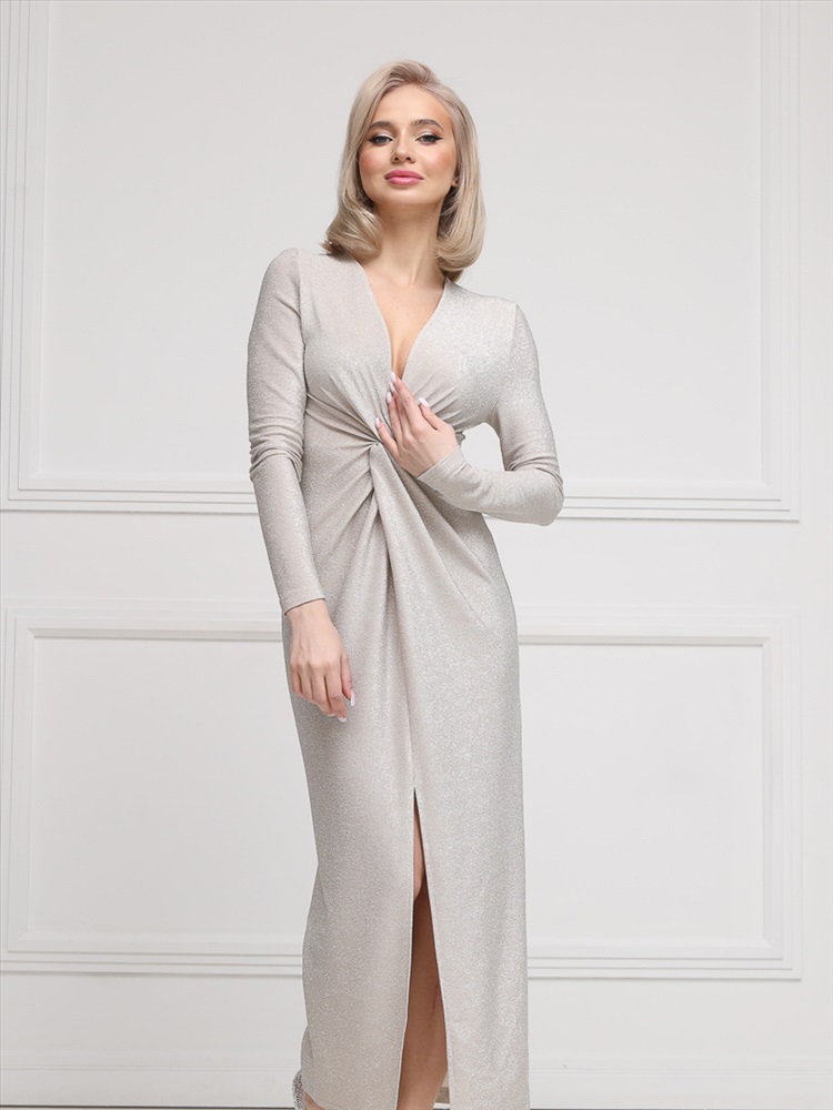 Роскошное платье прилегающего силуэта из трикотажного полотна с люрексом. V-образный вырез обработан окантовкой и дополнен декоративным перекрутом. Платье с втачными рукавами. Перед дополнен вырезом. Длина изделия по спинке от плечевого шва до низа изделия — см. Рост фотомодели — 170 см.