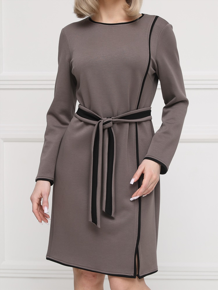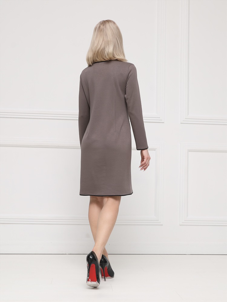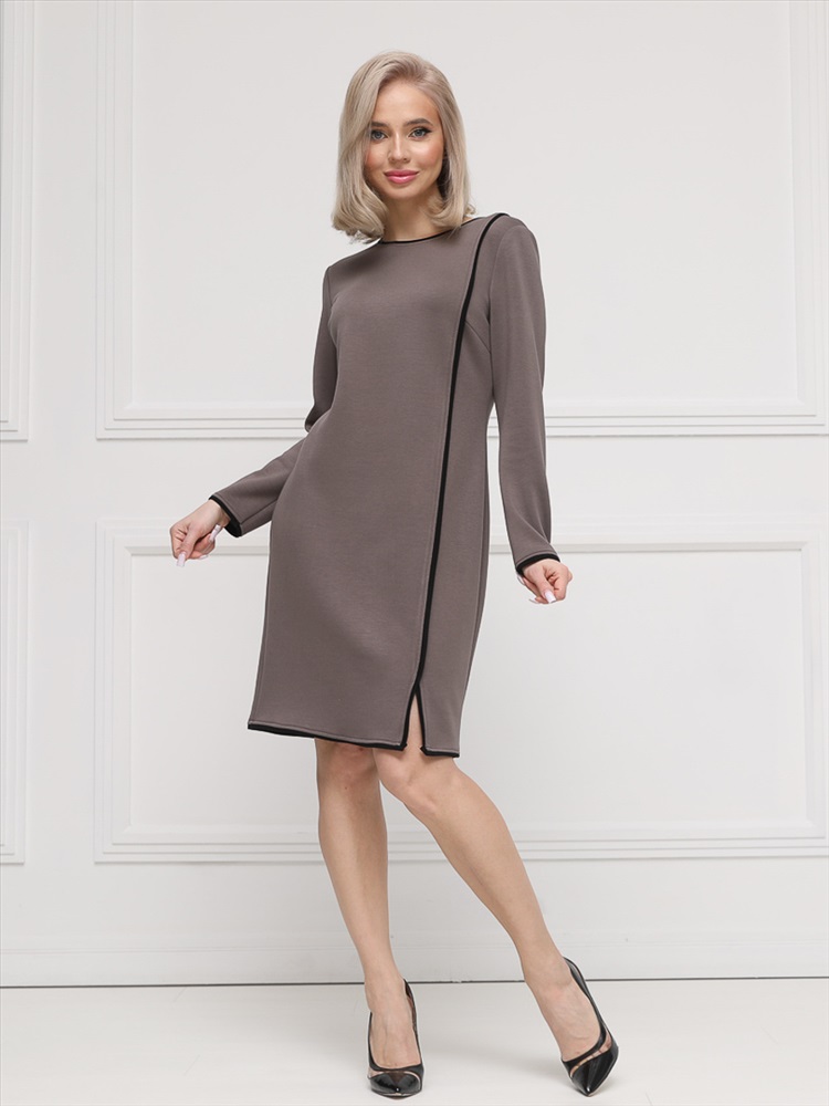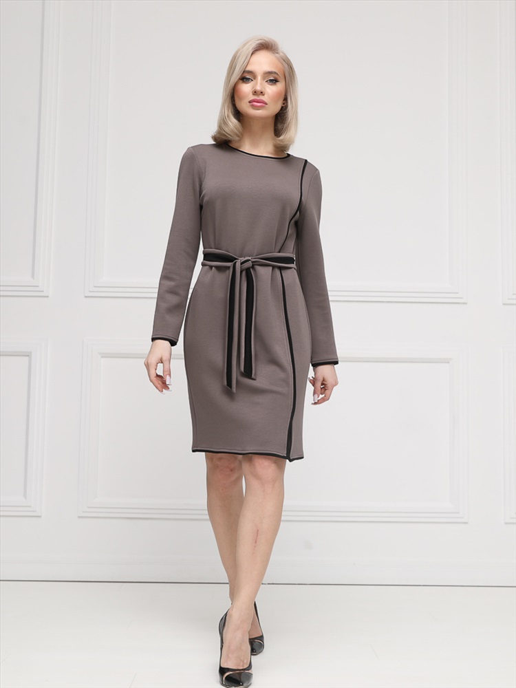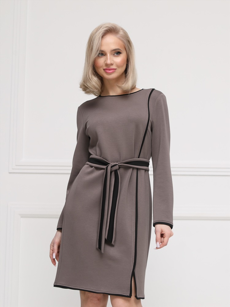 Стильное платье прямого силуэта из трикотажного полотна бежевого цвета. Круглый вырез изделия обработан контрастной окантовкой. Платье с втачными рукавами. Перед изделия, рукава и низ изделия дополнены контрастными окантовками. По переду изделия -разрез. В комплект входи пояс. Длина изделия по спинке от плечевого шва до низа изделия — см.