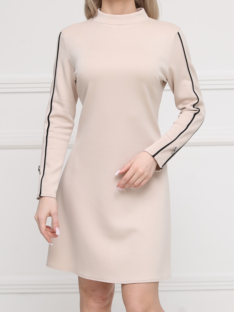 ШтрихКод: 4620306114261 По размеру: 48, 50, 52, 54, 56 Состав: Вискоза 95% Эластан 5% Скидка на сайте: Без скидки Стильное платье полуприлегающего силуэта из трикотажного полотна молочного цвета. Круглый вырез изделия обработан воротником стойка, по спинке дополнен разрезом с застежкой на пуговицу. Втачные рукава дополнены контрастными кантами и пуговицами. Длина изделия по спинке от плечевого шва до низа изделия - 95 см. Рост фотомодели — 170 см. Комментарии к товару