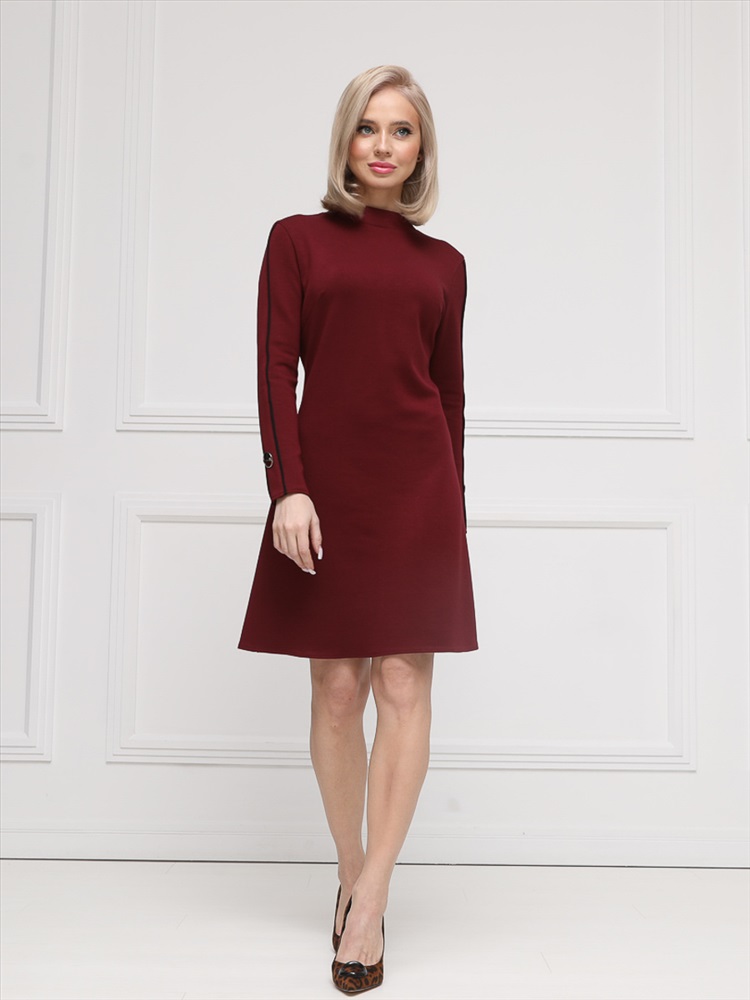 ШтрихКод: 4620306114377 По размеру: 46, 48, 50, 52, 54, 56 Состав: Вискоза 95% Эластан 5% Скидка на сайте: Без скидки Стильное платье полуприлегающего силуэта из трикотажного полотна бордового цвета. Круглый вырез изделия обработан воротником стойка, по спинке дополнен разрезом с застежкой на пуговицу. Втачные рукава дополнены контрастными кантами и пуговицами. Длина изделия по спинке от плечевого шва до низа изделия - 95 см. Рост фотомодели — 170 см. Комментарии к товару