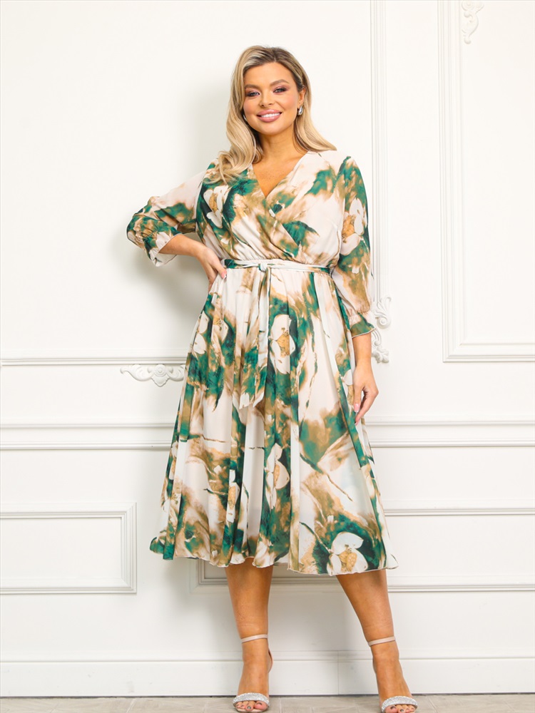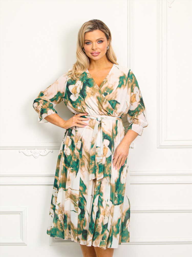 Восхитительное платье полуприлегающего силуэта из шифона бежево-зеленого цвета. Верхняя часть переда выполнена в форме запаха. Завышенная линия талии эффектно подчекрнута внутренним поясом с резинкой и сборкой. По низу втачных рукавов декоративный шов "закрутка". По низу изделия выполнен декоративный шов «закрутка». Платье на трикотажном подкладе. В комплект входит пояс. Длина изделия по спинке от плечевого шва до низа изделия — см. Рост фотомодели — 170 см.